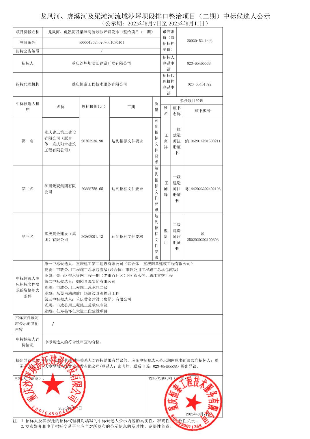 龙凤河、虎溪河及梁滩河流域沙坪坝段排口整治项目(二期)中标候选人公示