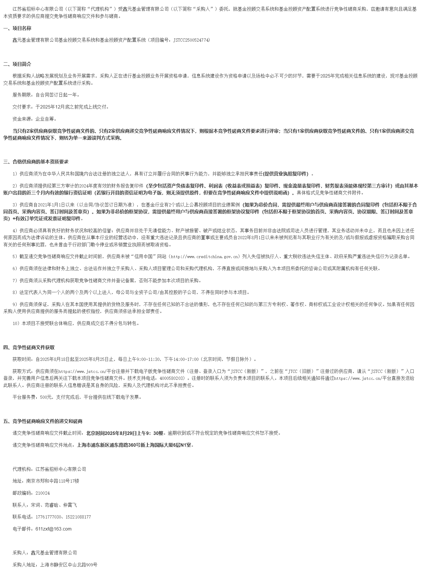 江苏省招标中心有限公司(以下简称“代理机构”)受鑫元基金管理有限公司(以下简称“采购人”)委托,就基金投顾交易系统和基金投顾资产配置系统进行竞争性磋商采购,兹邀请有意向且满足基本资质要求的供应商提交竞争性磋商响应文件和参与磋商。