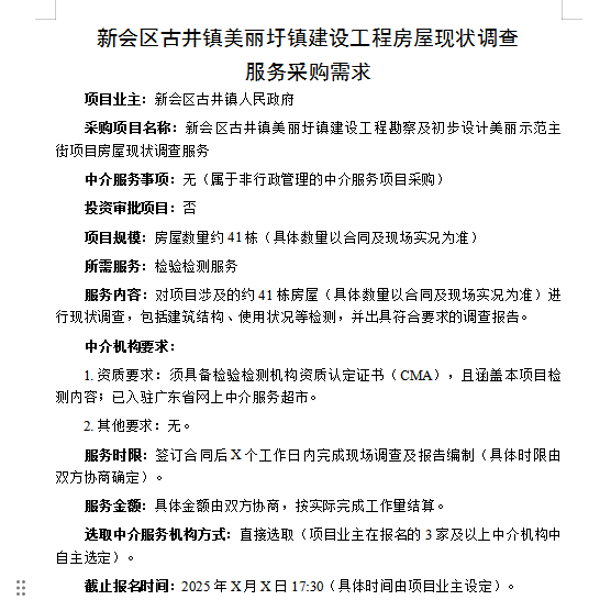 新会区古井镇美丽圩镇建设工程房屋现状调查服务采购失败项目公示