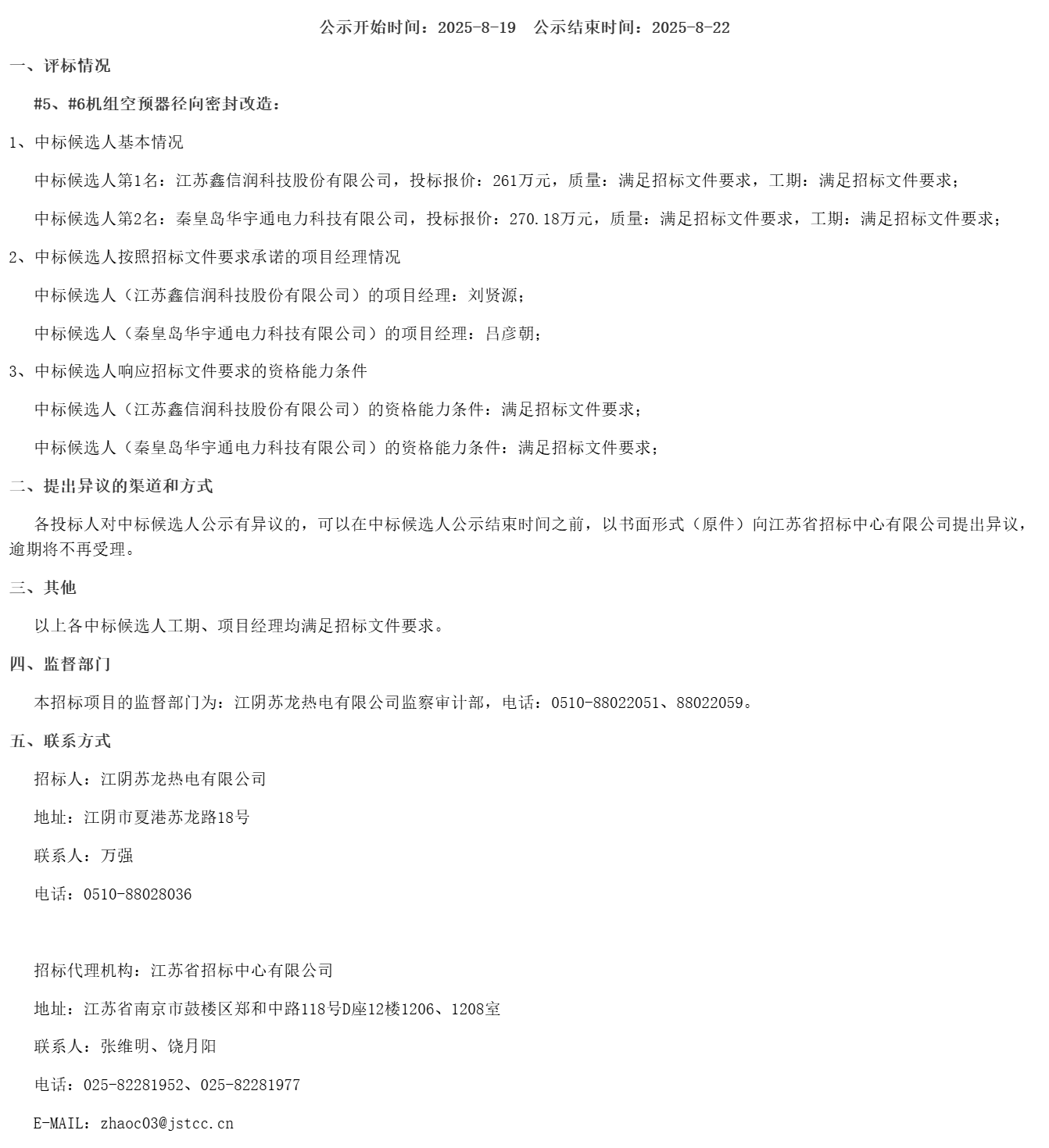江阴苏龙热电有限公司#5、#6机组空预器径向密封改造中标候选人公示(JSTCC2500314404)