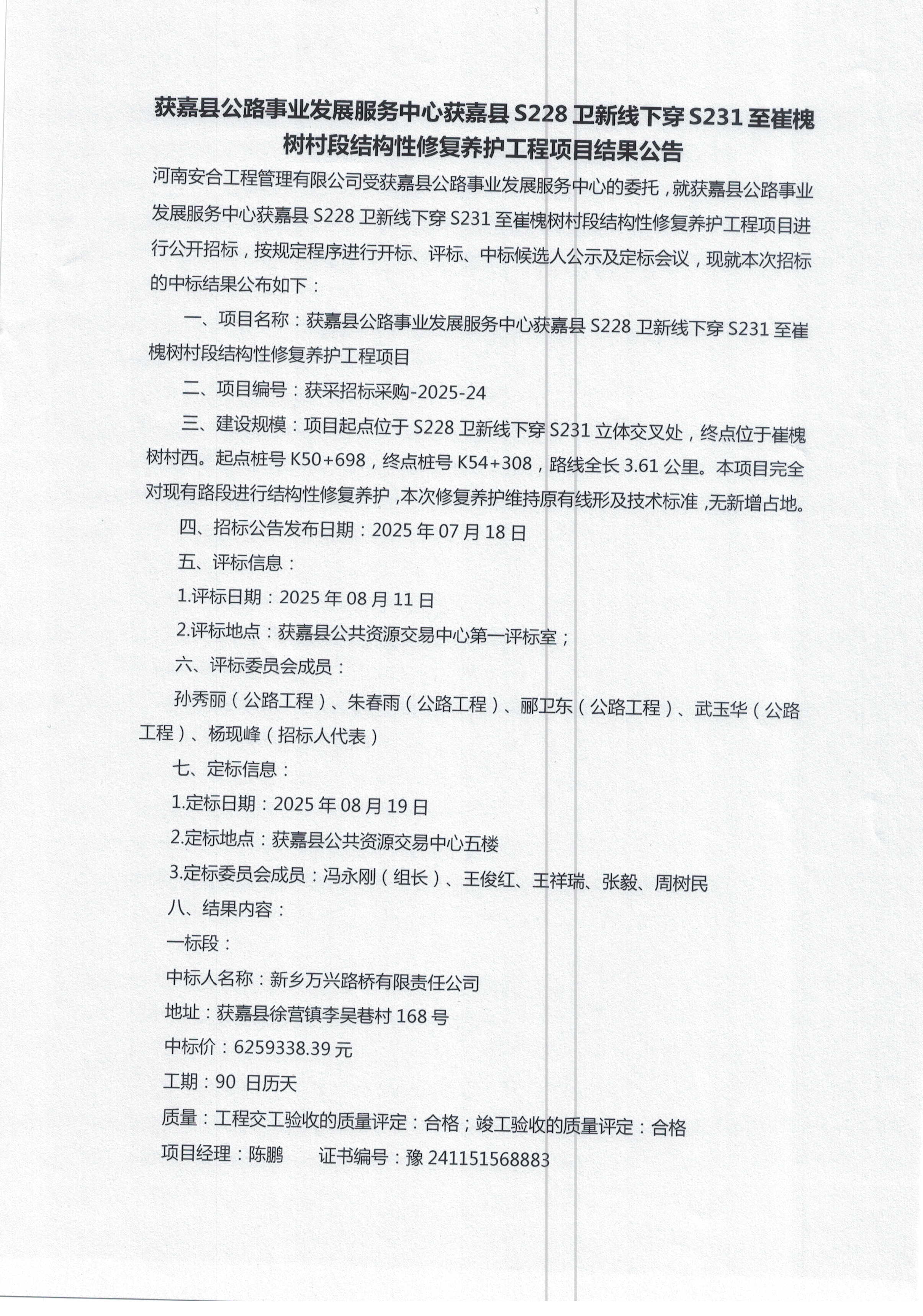 获嘉县公路事业发展服务中心获嘉县****卫新线下穿****至崔槐树村段结构性修复养护工程项目结果公告