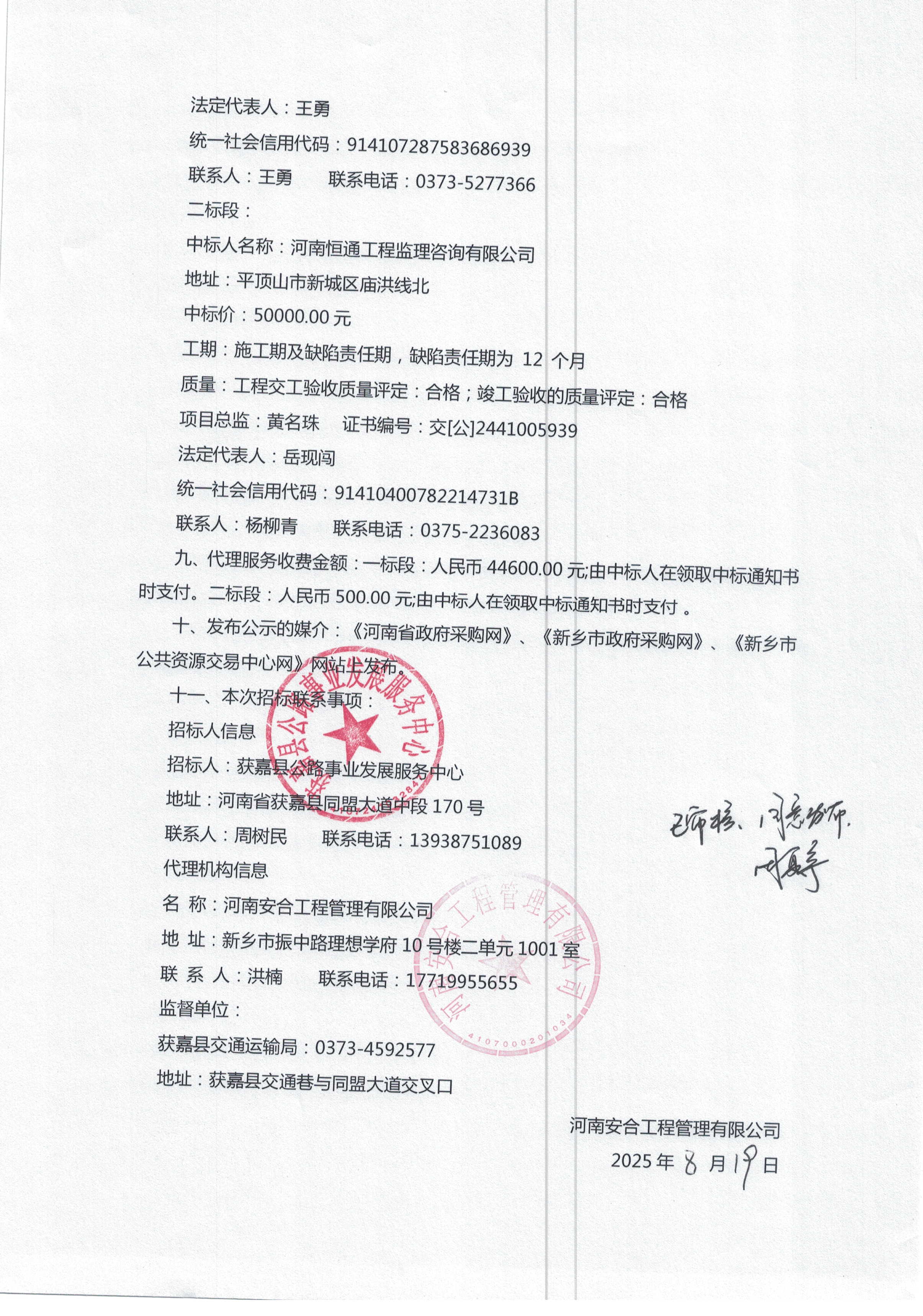 获嘉县公路事业发展服务中心获嘉县****卫新线下穿****至崔槐树村段结构性修复养护工程项目*中标公告
