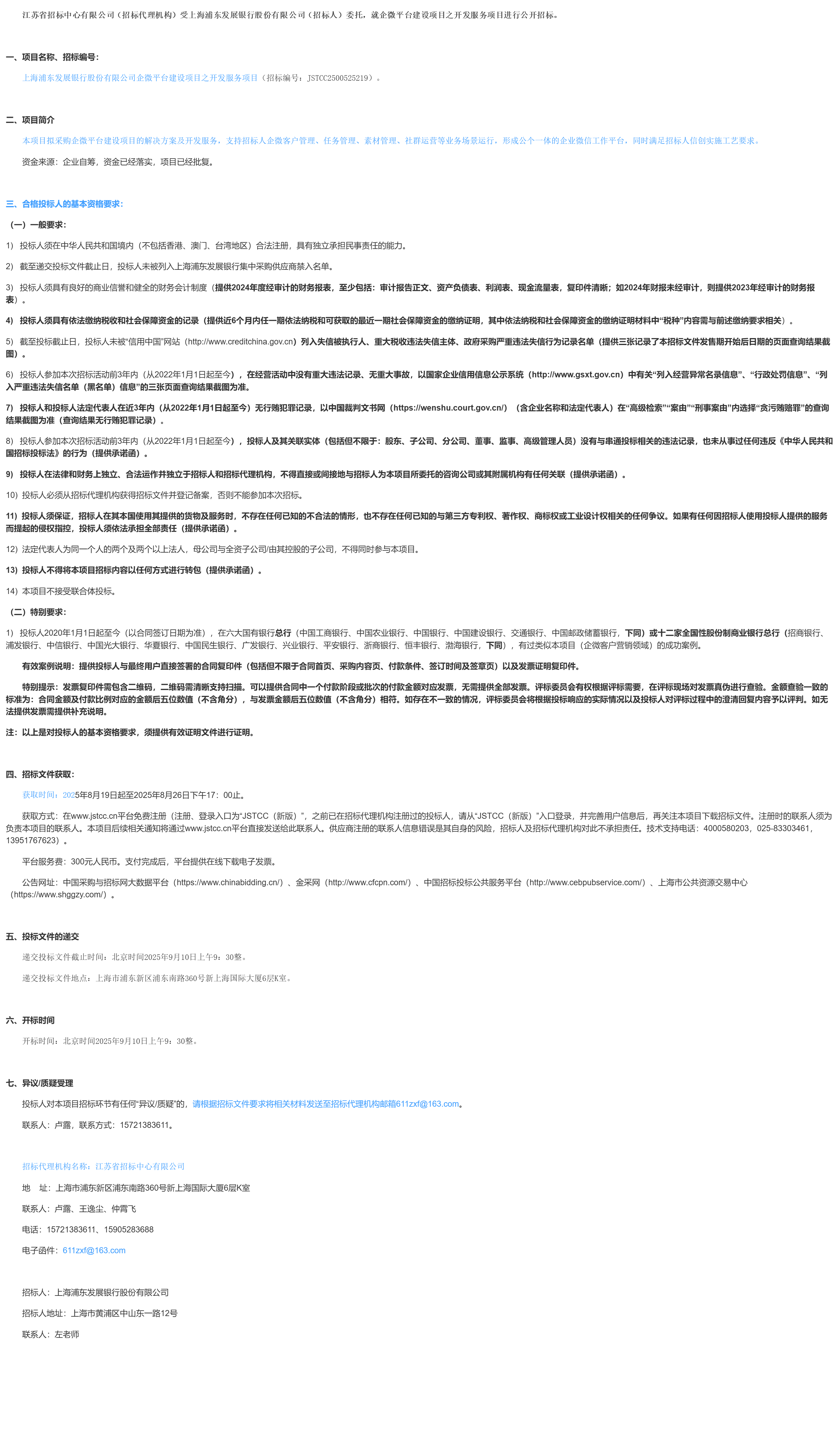 江苏省招标中心有限公司(招标代理机构)受上海浦东发展银行股份有限公司(招标人)委托,就企微平台建设项目之开发服务项目进行公开招标。