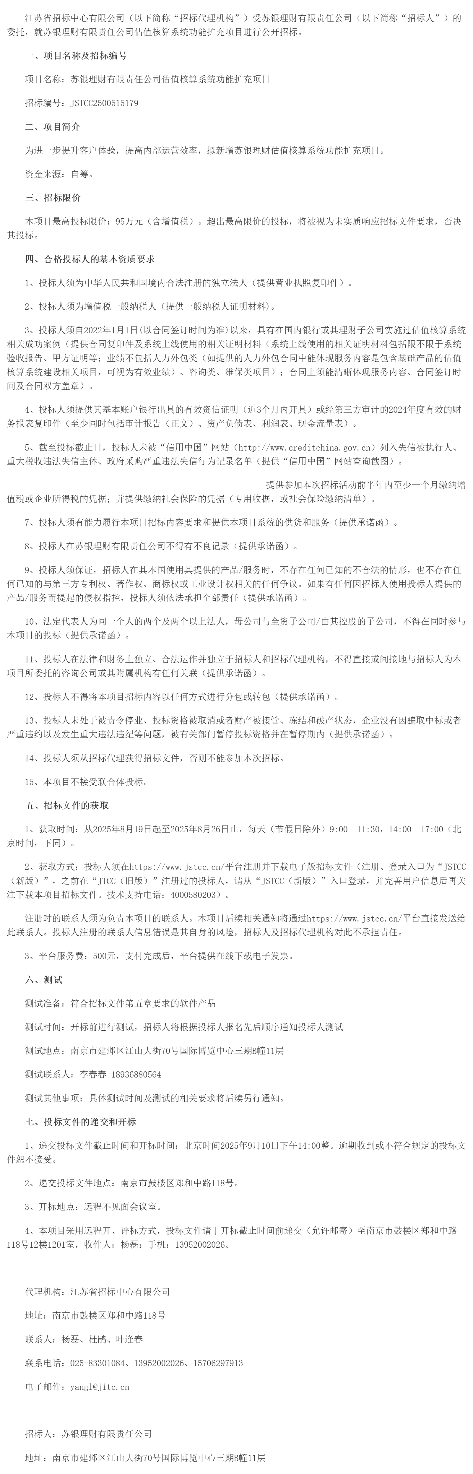 苏银理财有限责任公司估值核算系统功能扩充项目招标公告