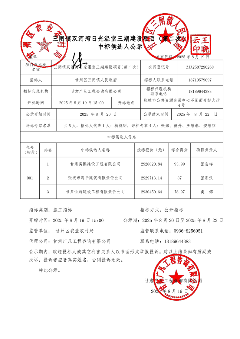 [市本级]三闸镇双河湾日光温室三期建设项目(第二次)中标候选人公示