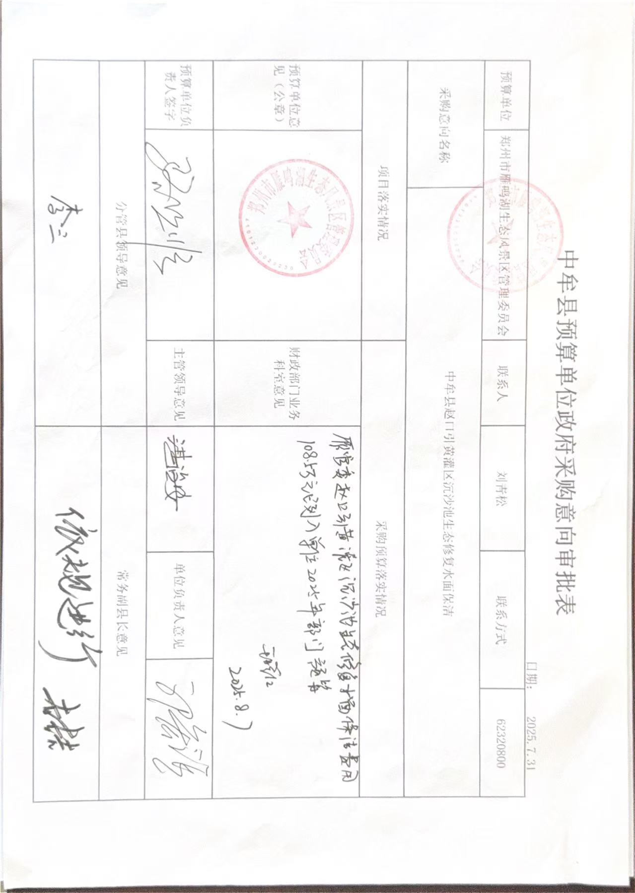 郑州市雁鸣湖生态风景区管理委员会2025年8至9月政府采购意向