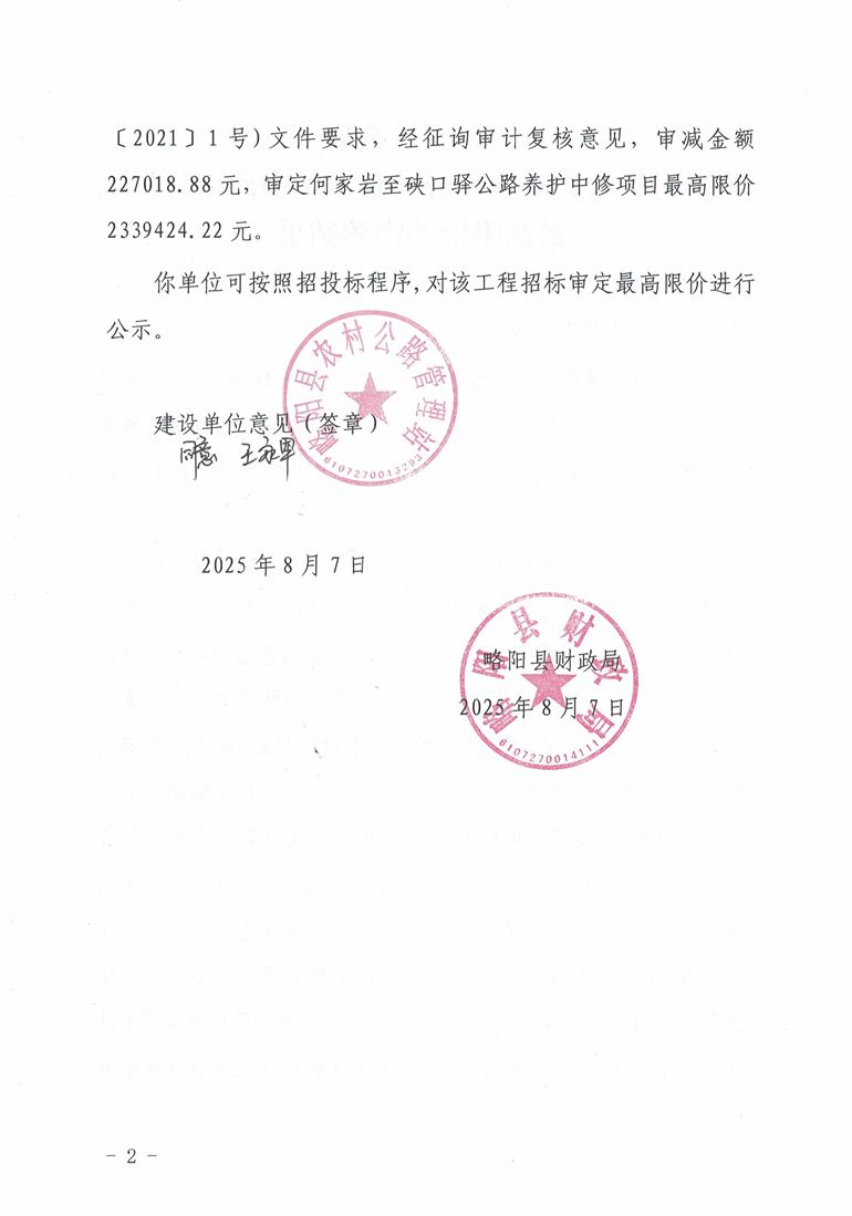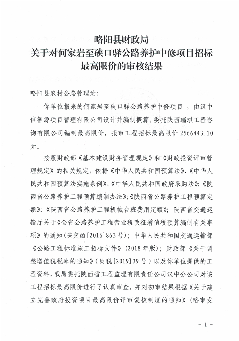 略阳县财政局关于对何家岩至硖口驿公路养护中修项目招标最高限价的审核结果