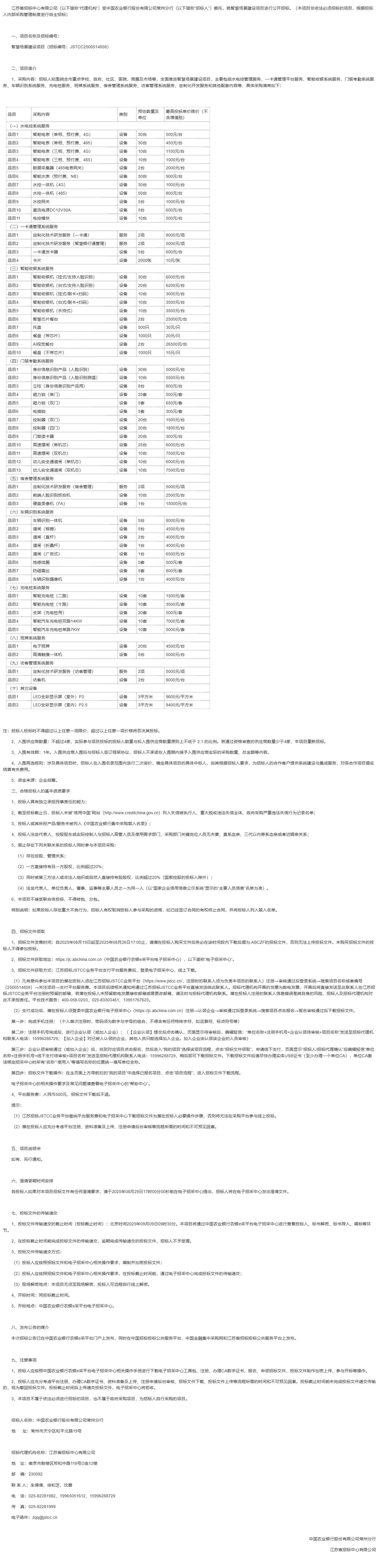 江苏省招标中心有限公司(以下简称“代理机构”)受中国农业银行股份有限公司常州分行(以下简称“招标人”)委托,就智慧场景建设项目进行公开招标。(本项目非依法必须招标的项目,根据招标人内部采购管理制度进行自主招标)