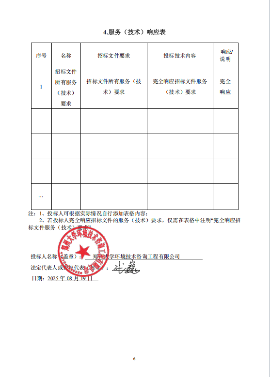 | 本项目公告发布之日同时向中标人发出中标通知书;以邮寄、电子邮件等方式对未通过资格审查的投标人,告知其未通过的原因;参与评审但未中标的,告知其本人的评审得分与排序。 *.投标人排序及得分情况:排序*:郑州大学环境技术咨询工程有限公司,最终得分:**.**分;排序*:河南可人科技有限公司,最终得分:**.**分;排序*:苏州清咨威特环保科技有限公司,最终得分:**.**分;排序*:河南省科悦环境技术有限公司,最终得分:**.**分;排序*:河南蓝天环境工程有限公司,最终得分:**.**分。 *.各有关当事人对中标结果有异议的,可以在中标公告发布之日起七个工作日内,以书面形式向招标人提出质疑,并以供应商提交的质疑函接受确认日期作为受理时间,逾期未提交的不再受理。 | |||||||||||||||||||||||||||||||