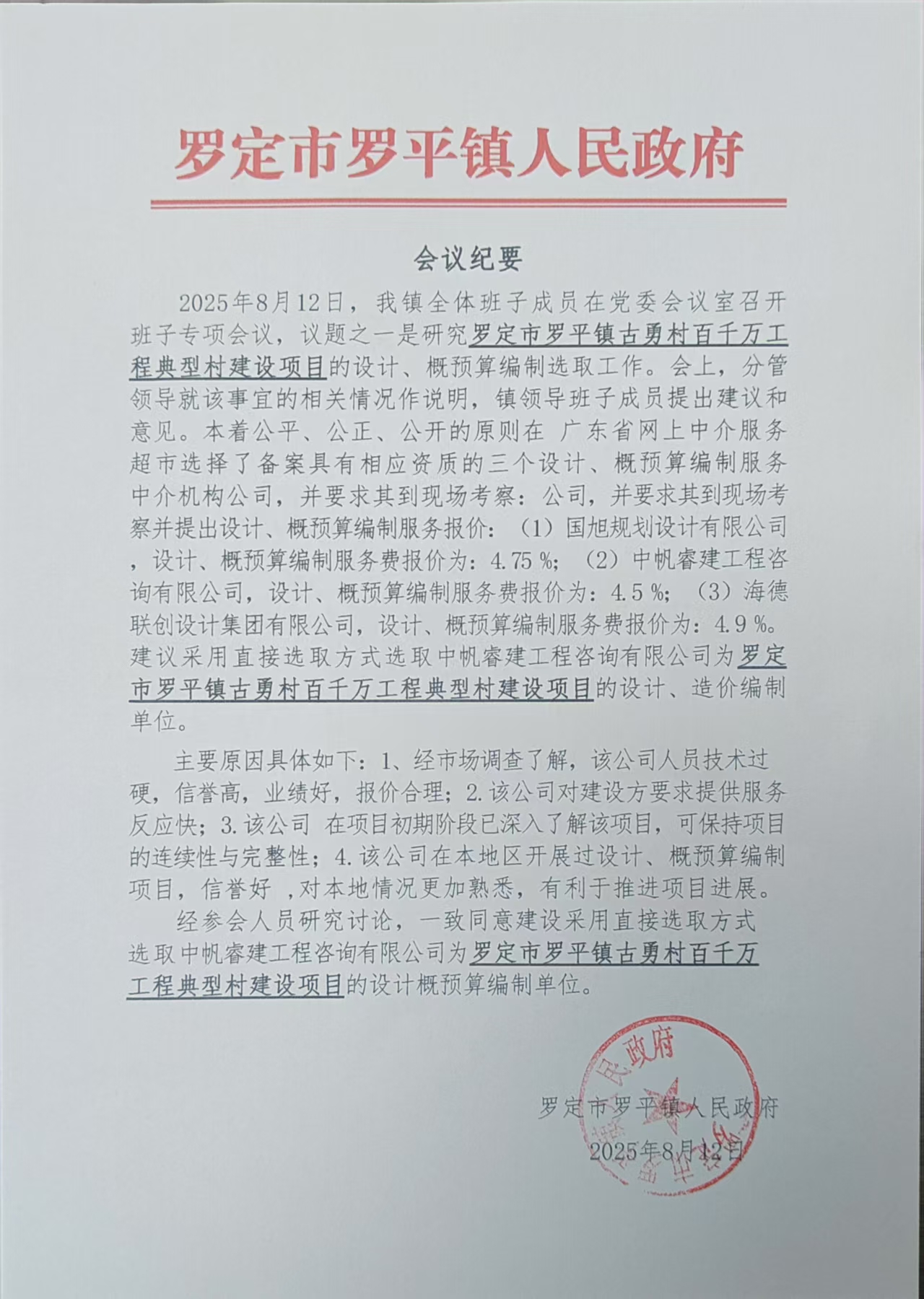 罗定市罗平镇古勇村百千万工程典型村建设项目【工程设计、工程造价咨询】中选公示