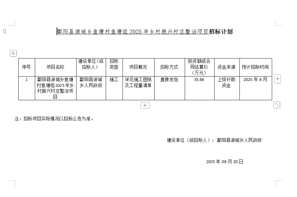 鄱阳县游城乡鱼塘村鱼塘组2025年乡村振兴村庄整治项目招标计划