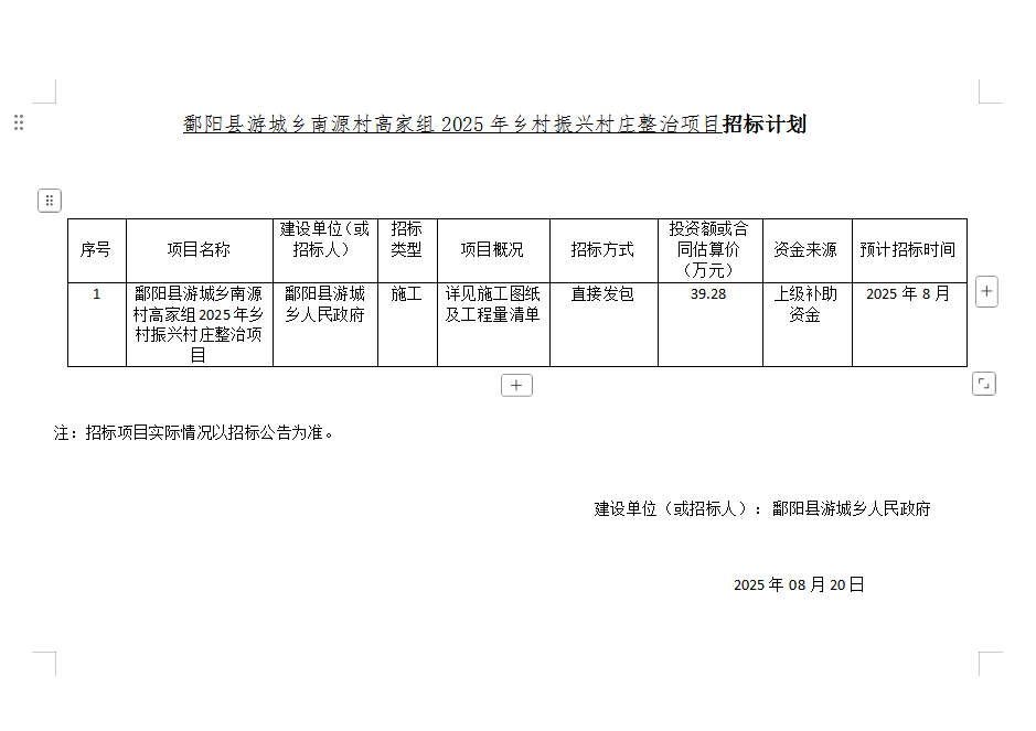 鄱阳县游城乡南源村高家组2025年乡村振兴村庄整治项目招标计划