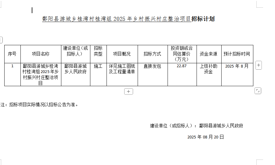 鄱阳县游城乡桂湾村桂湾组 2025 年乡村振兴村庄整治项目招标计划