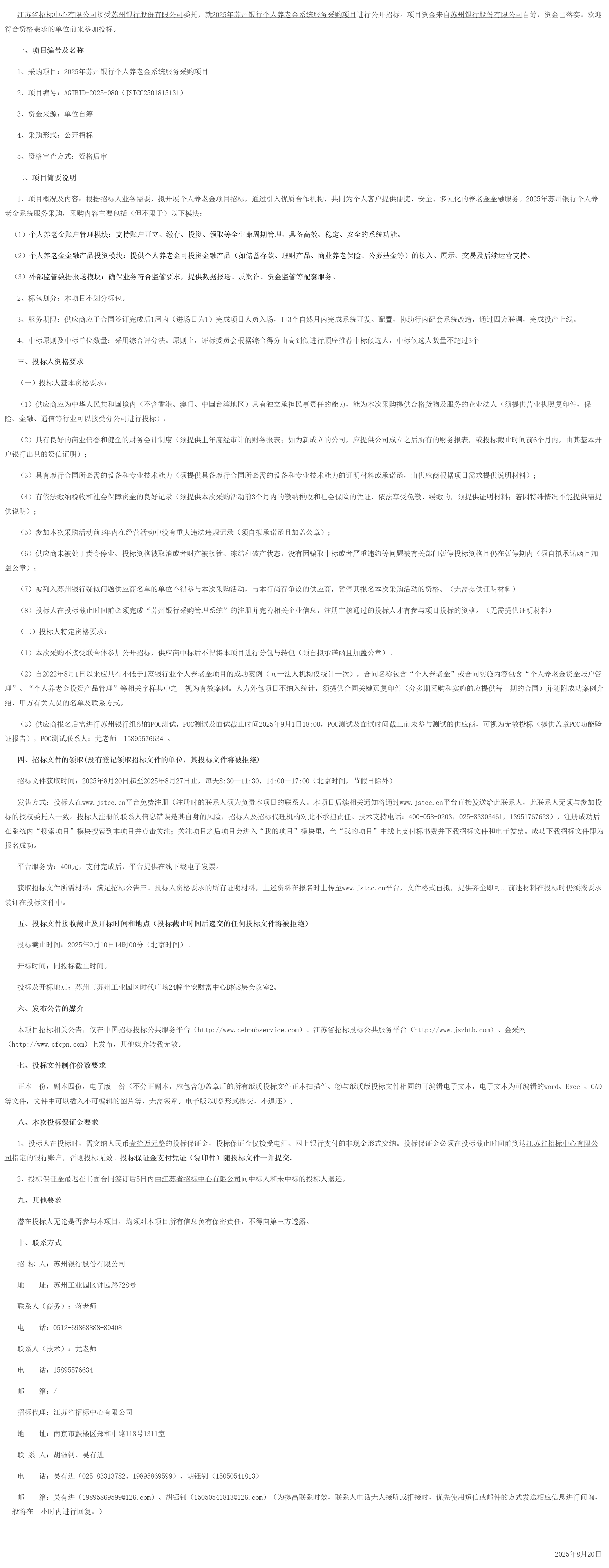 ****年苏州银行个人养老金系统服务采购项目招标公告