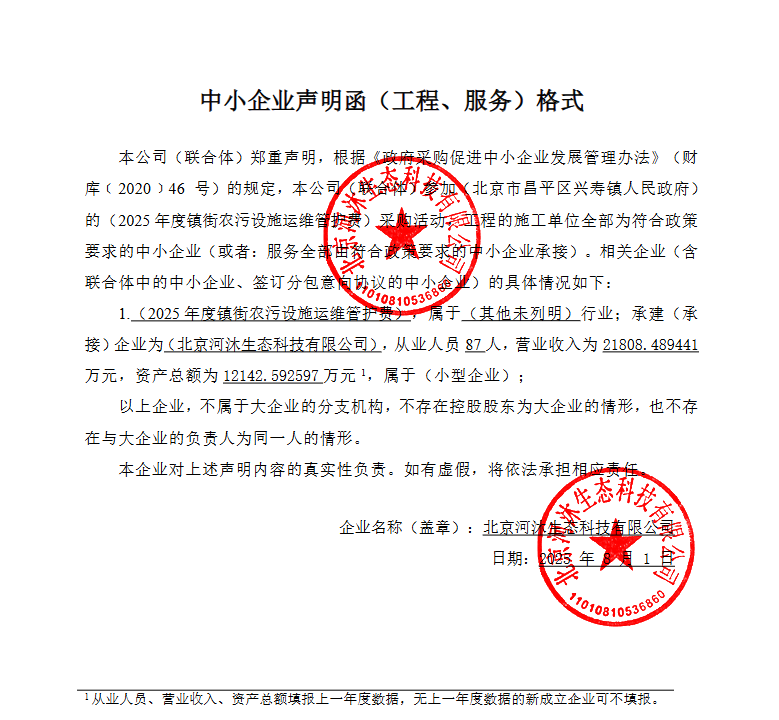 | 北京河沐生态科技有限公司 | * | ***.******万元 | ***.******万元 | 负责昌平区兴寿镇权属范围内污水设施管护工作,实行“专人巡查+定期维护”模式,由专业运维人员负责日常巡检,定期对设施进行巡查,及时记录设施运行状况、对设备进行维护保养、对管网进行排查和疏通,确保污水畅通。维护规模:本项目涉及运维管护总长度******.**米,污水处理规模****吨/天,污水泵站****立方米/天(具体要求详见招标文件第五章采购需求)。 |