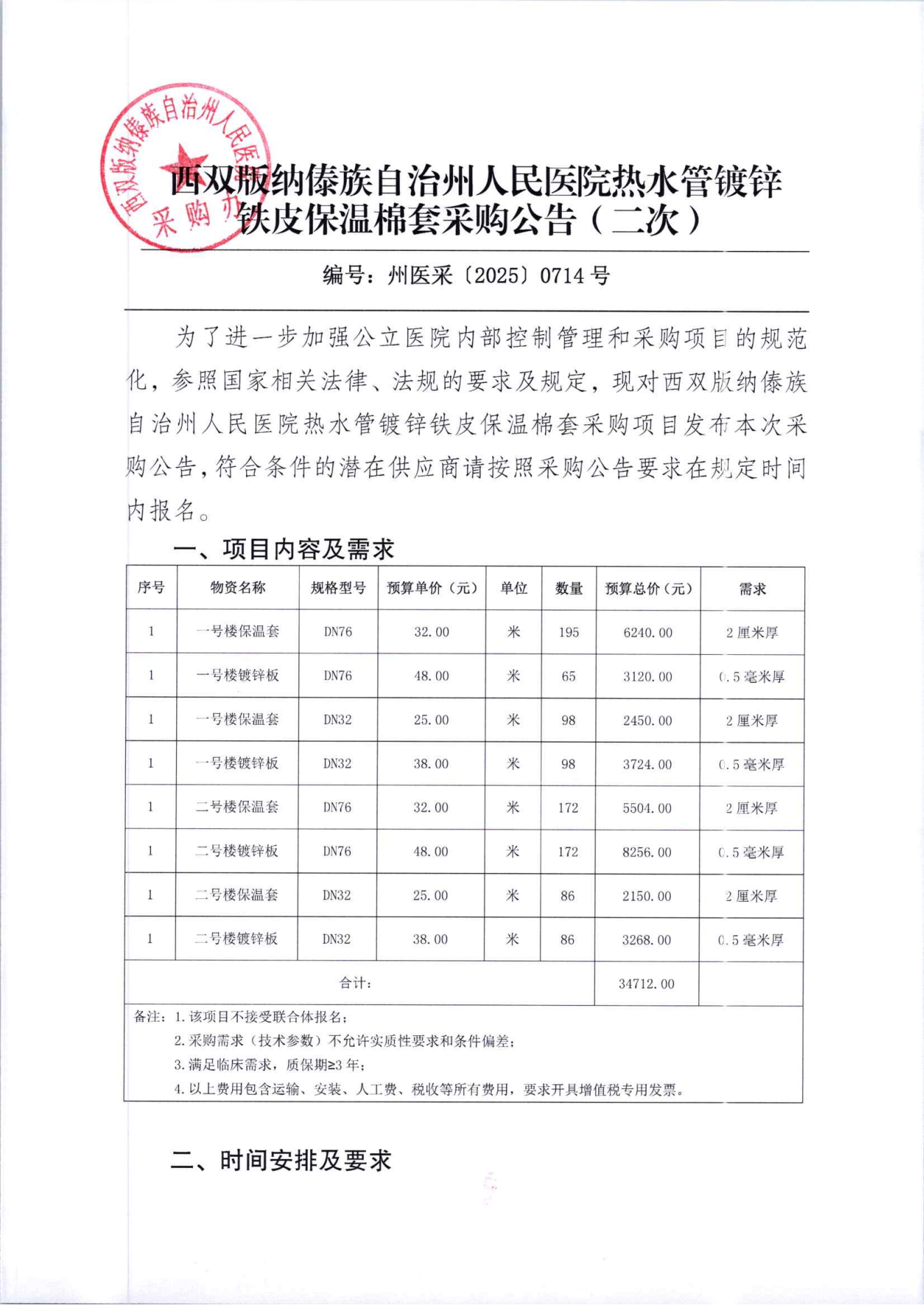 西双版纳傣族自治州人民医院热水管镀锌铁皮保温棉套采购公告(二次)