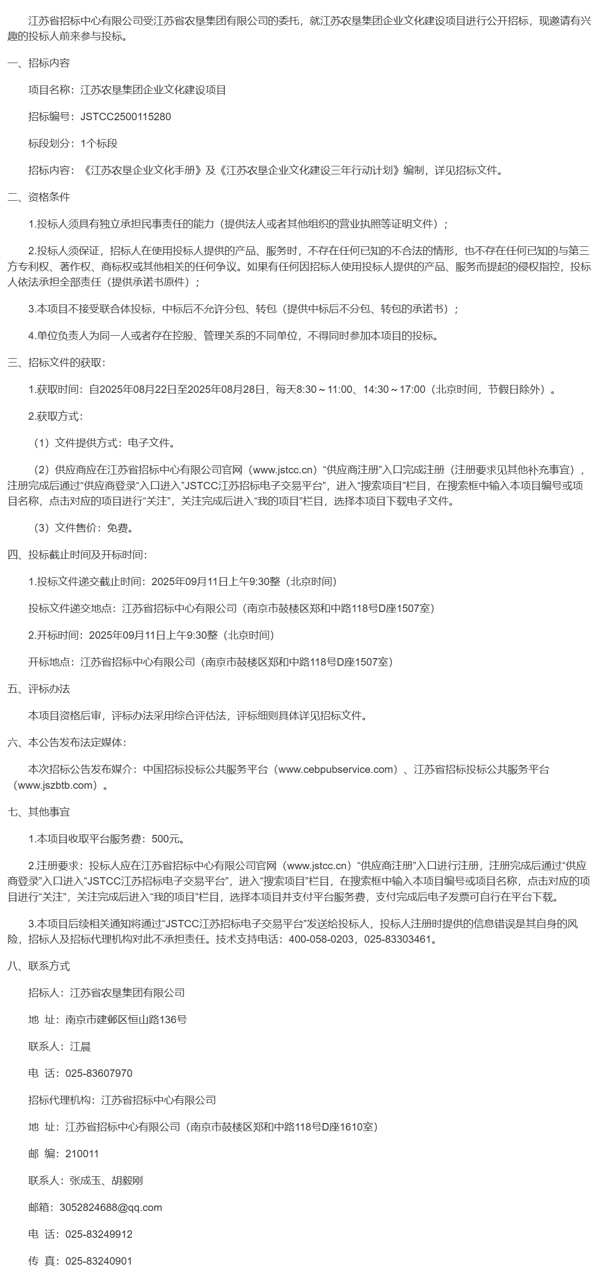 江苏省招标中心有限公司受江苏省农垦集团有限公司的委托,就江苏农垦集团企业文化建设项目进行公开招标,现邀请有兴趣的投标人前来参与投标。