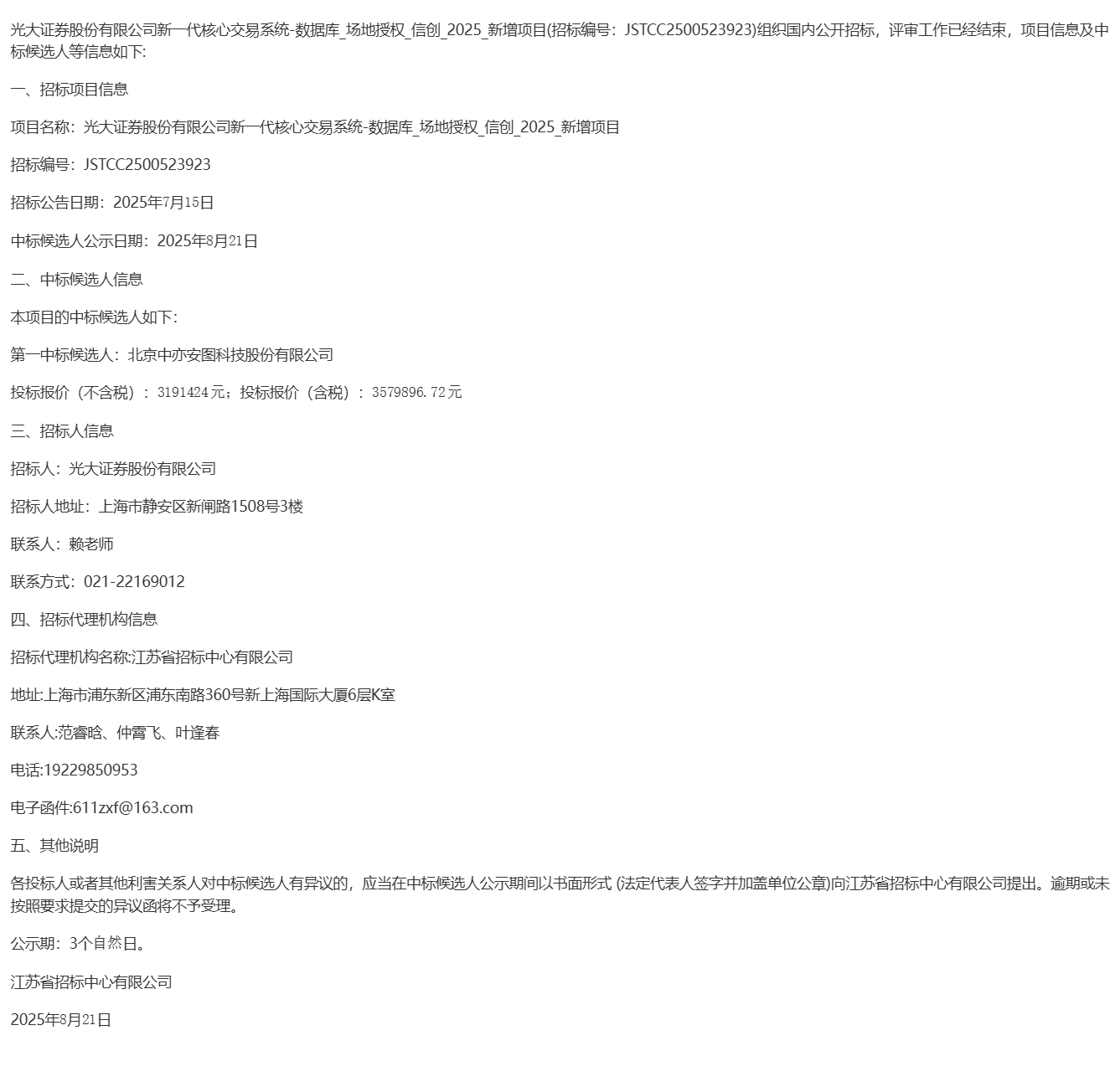 光大证券股份有限公司新一代核心交易系统-数据库_场地授权_信创_2025_新增项目中标候选人公示