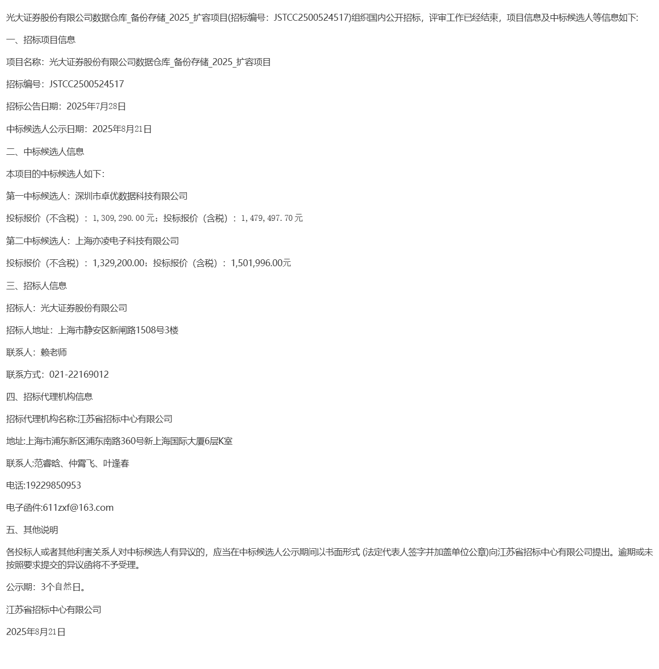 光大证券股份有限公司数据仓库_备份存储_2025_扩容项目中标候选人公示