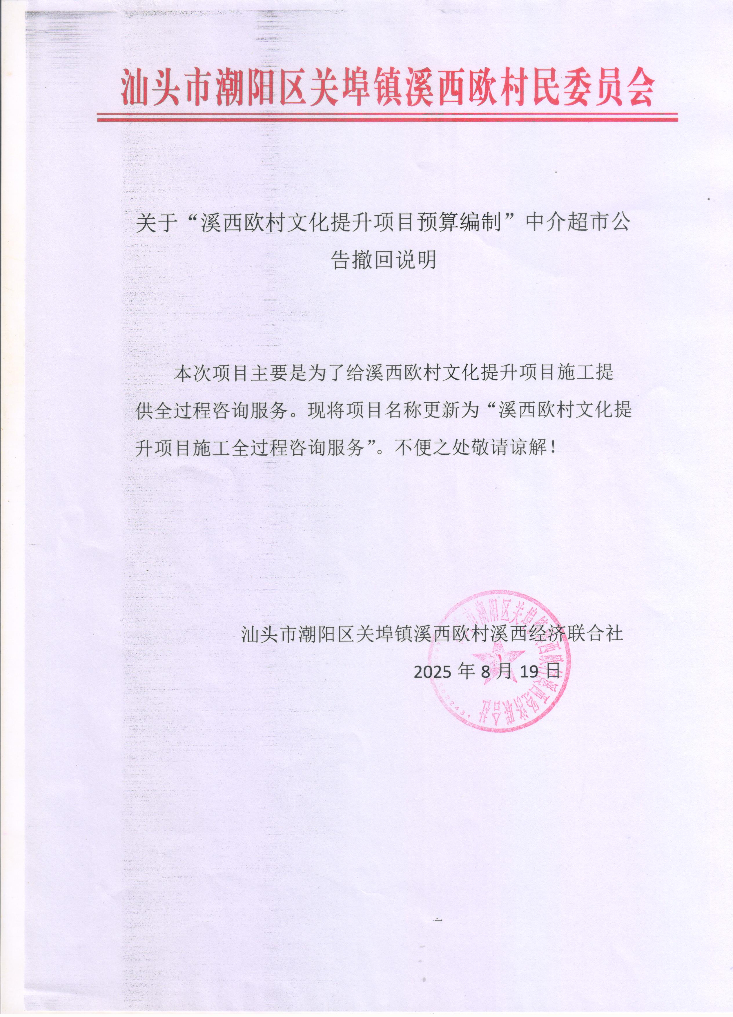 本次项目主要是为了给溪西欧村文化提升项目施工提供全过程咨询服务。现将公告取消,重新发布。