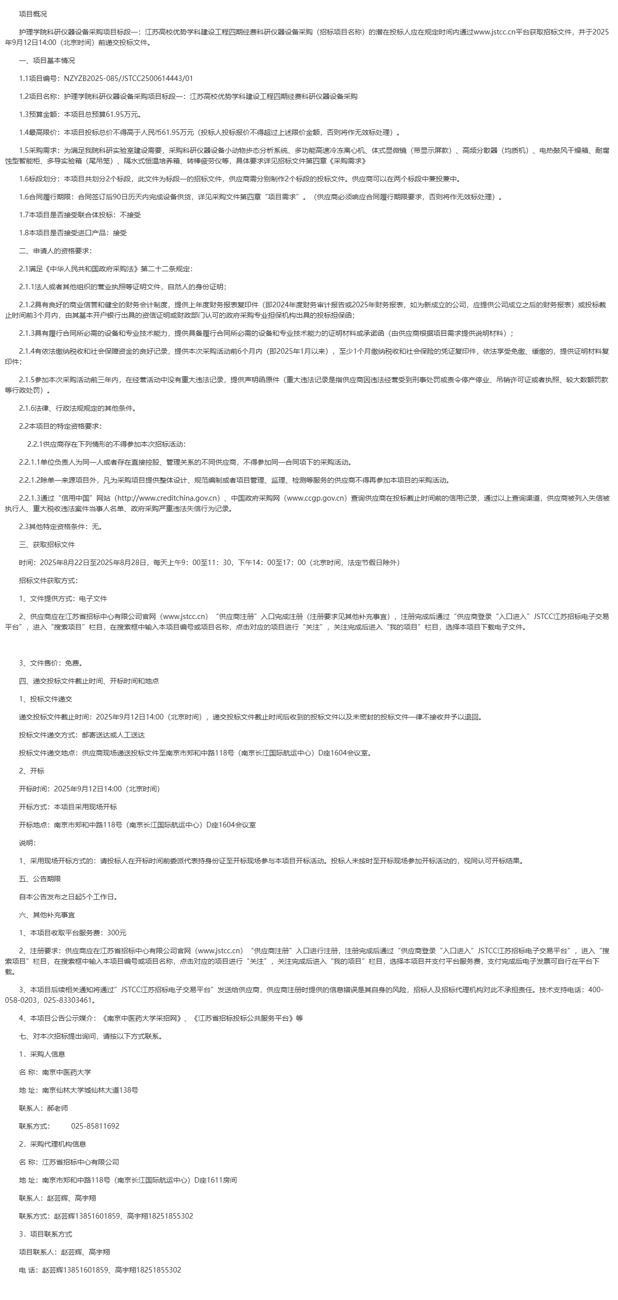 护理学院科研仪器设备采购项目标段一:江苏高校优势学科建设工程四期经费科研仪器设备采购(招标项目名称)的潜在投标人应在规定时间内通过***.*****.**平台获取招标文件,并于****年*月**日**:**(北京时间)前递交投标文件。