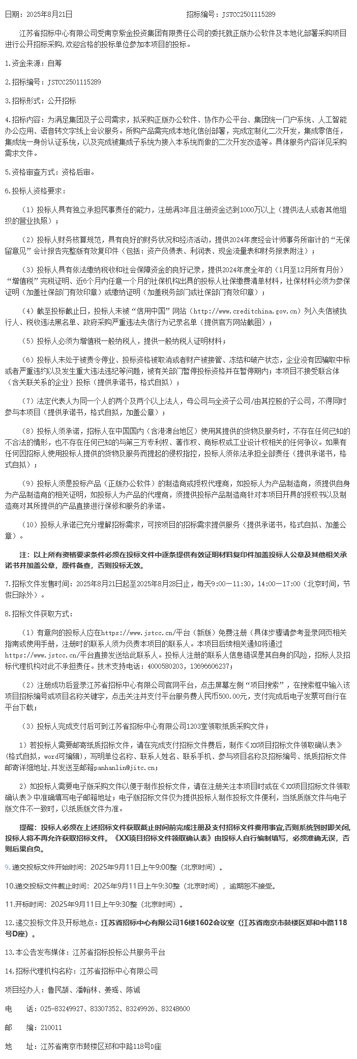 江苏省招标中心有限公司受南京紫金投资集团有限责任公司的委托就正版办公软件及本地化部署采购项目进行公开招标采购,欢迎合格的投标单位参加本项目的投标。