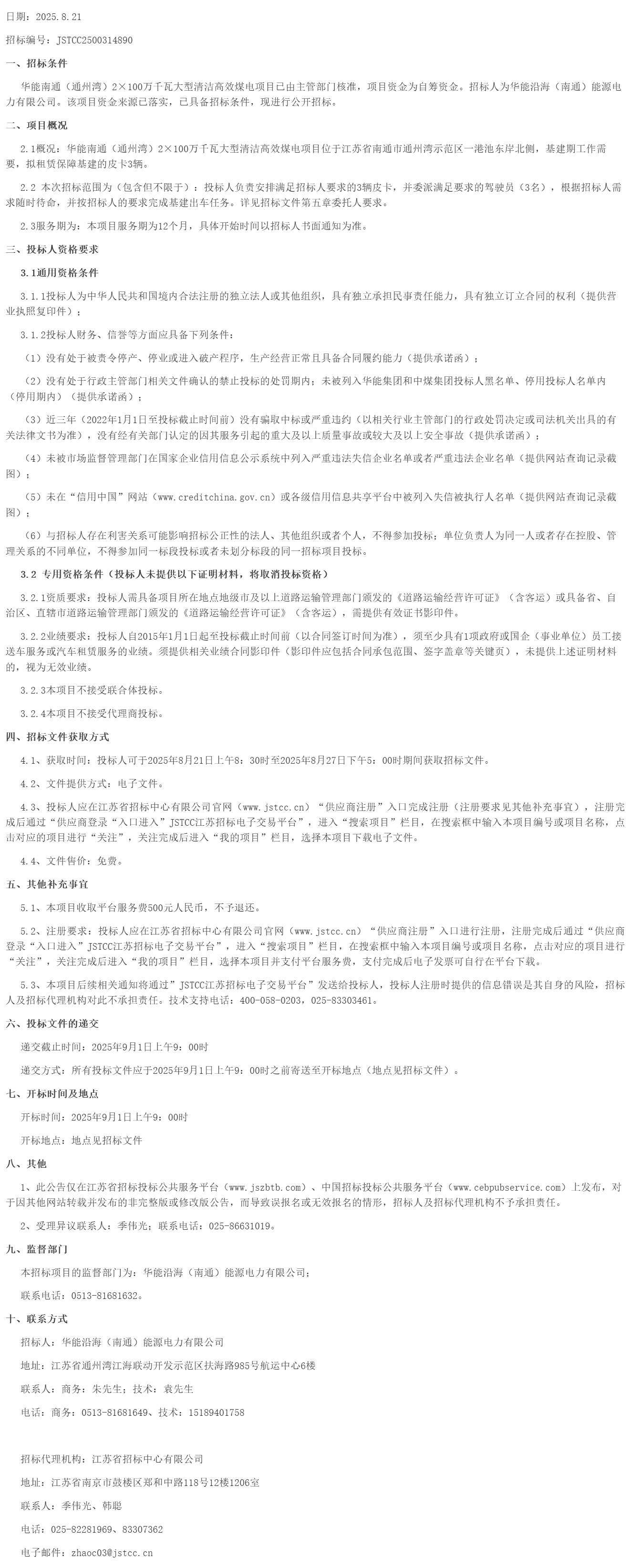 本招标项目的监督部门为:华能沿海(南通)能源电力有限公司;