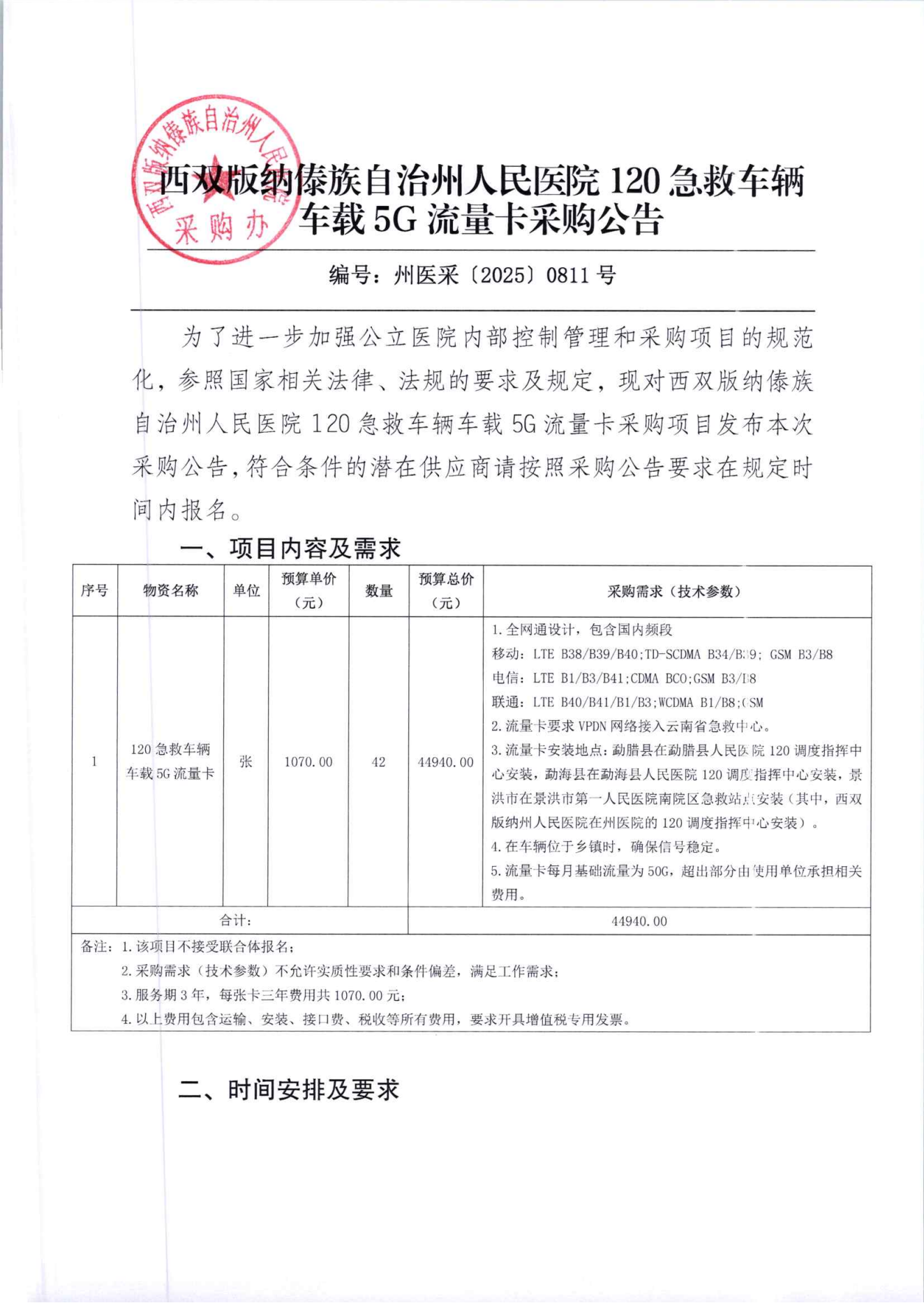 西双版纳傣族自治州人民医院120急救车辆车载5G流量卡采购公告