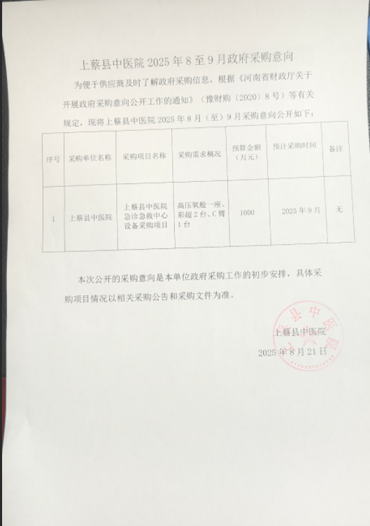 为便于供应商及时了解政府采购信息,根据《河南省财政厅关于开展政府采购意向公开工作的通知》(豫财购〔****〕*号)等有关规定,现将上蔡县中医院 ****年*(至)*月采购意向公开如下: |