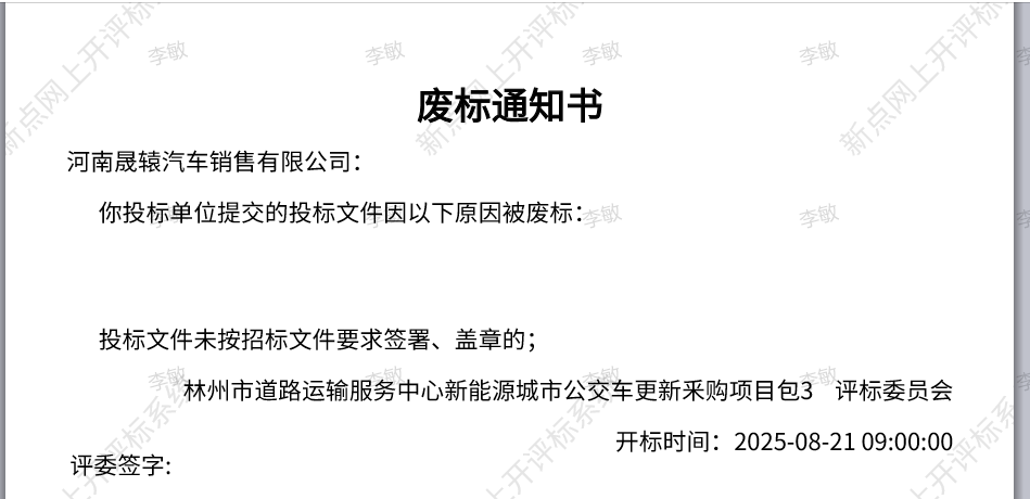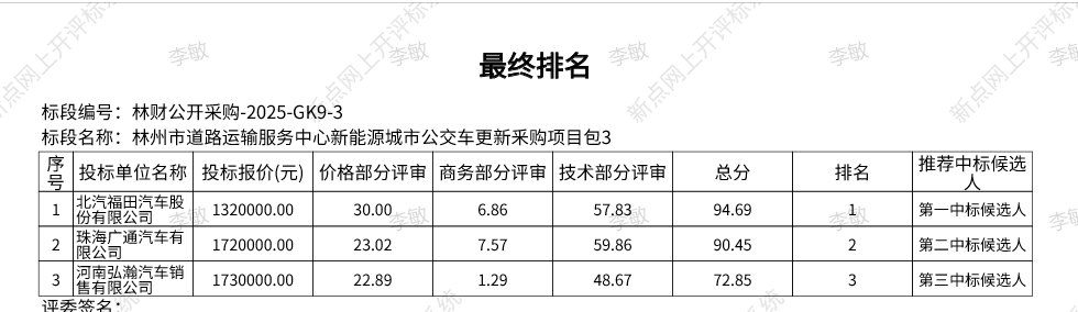 | 第一中标候选人:北汽福田汽车股份有限公司,价格得分**分,商务得分*.**分,技术得分**.**分,总分**.**分;第二中标候选人:珠海广通汽车有限公司,价格得分**.**分,商务得分*.**分,技术得分**.**分,总分**.**分;第三中标候选人:河南弘瀚汽车销售有限公司,价格得分**.**分,商务得分*.**分,技术得分**.**分,总分**.**分。废标情况 河南晟辕汽车销售有限公司 投标文件未按招标文件要求签署、盖章。 各有关当事人对中标结果有异议的,可以在中标公告期限届满之日起七个工作日内,以书面形式同时向采购人和采购代理机构提出质疑(加盖单位公章且法人签字),依据法规规定,质疑函应当有明确的请求和必要的证明材料。以质疑函接受确认日期作为受理时间,逾期提交或未按照要求提交的质疑函将不予受理。 | |||||||||||||||||||||||||||||||