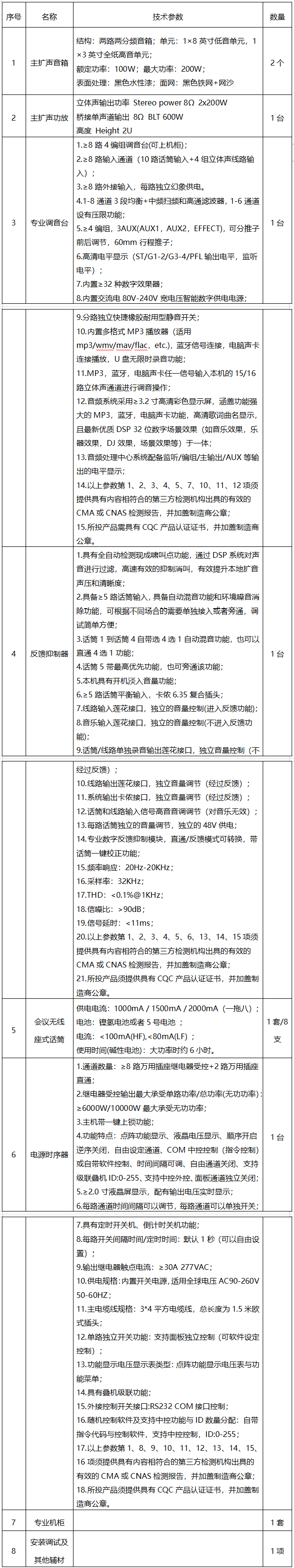 音响设备技术要求