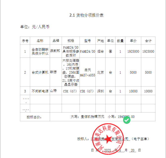 | *、采购内容:全自动酶联免疫分析仪的供货、运输、保险、装卸、验收交付、培训、技术支持、质保及相关伴随服全自动酶联免疫分析仪务等。 *、采购产品名称和数量:全自动酶联免疫分析仪*台。 *、质量要求:合格,满足国家相关标准及采购人要求。 *、交货地点:采购人指定地点 *、验收标准:按照招标文件的技术要求以及国家或行业现行标准执行。 *、供货期: 接到采购方通知后**日内供货; *、质保期:整机免费质保服务≥*年(从设备验收合格之日起)。 *、合同履行期限:合同签订之日起至质保期结束: | |||||||||||||||||||||||||||||||