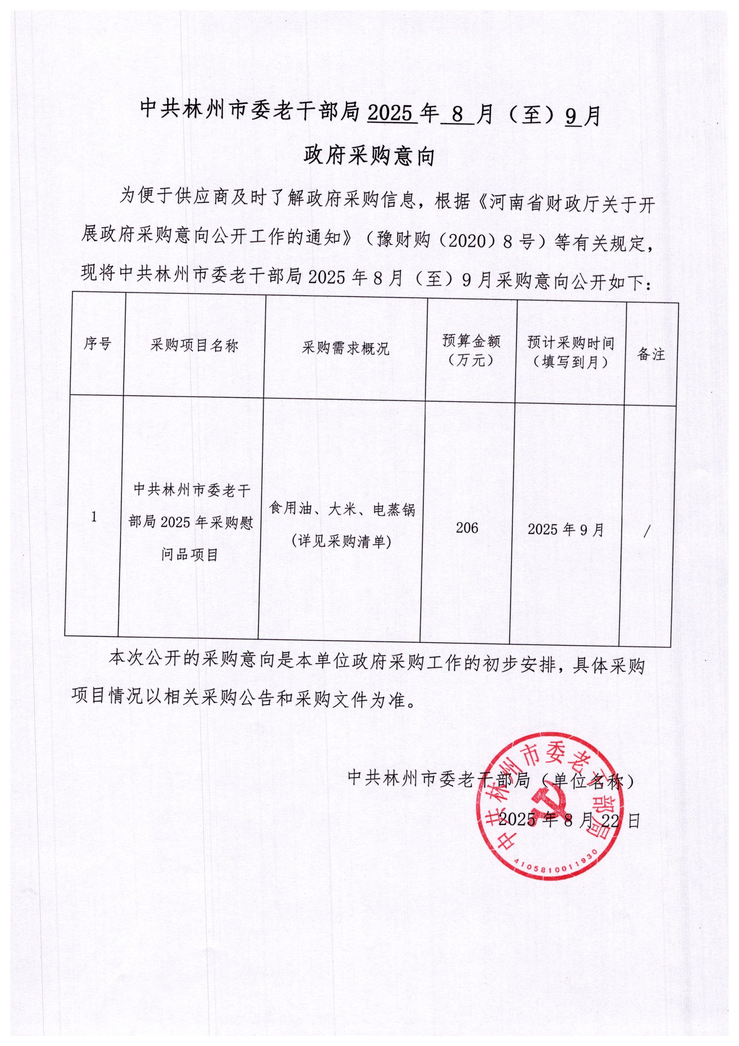 中共林州市委老干部局2025年采购慰问品项目2025年8至9月政府采购意向