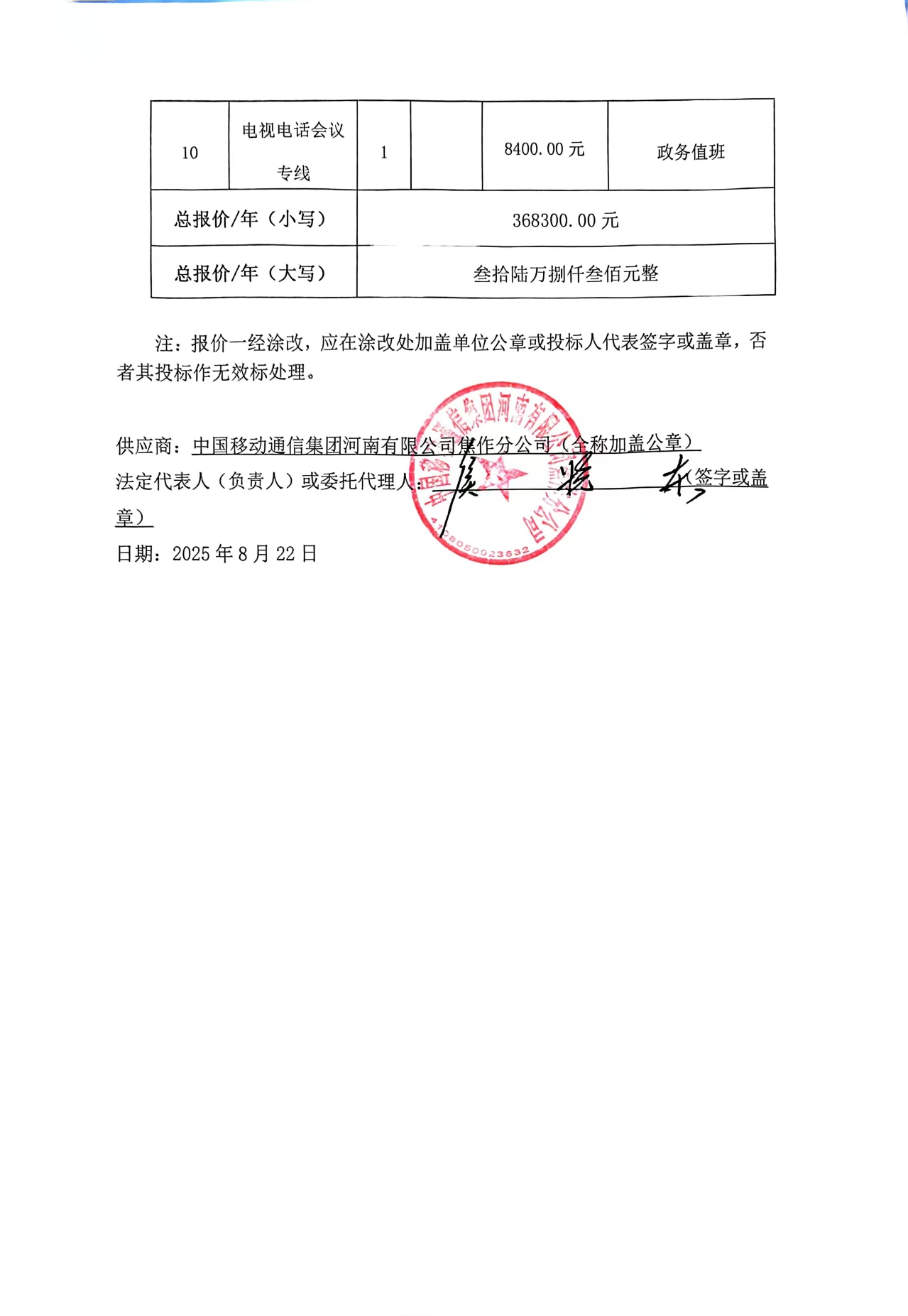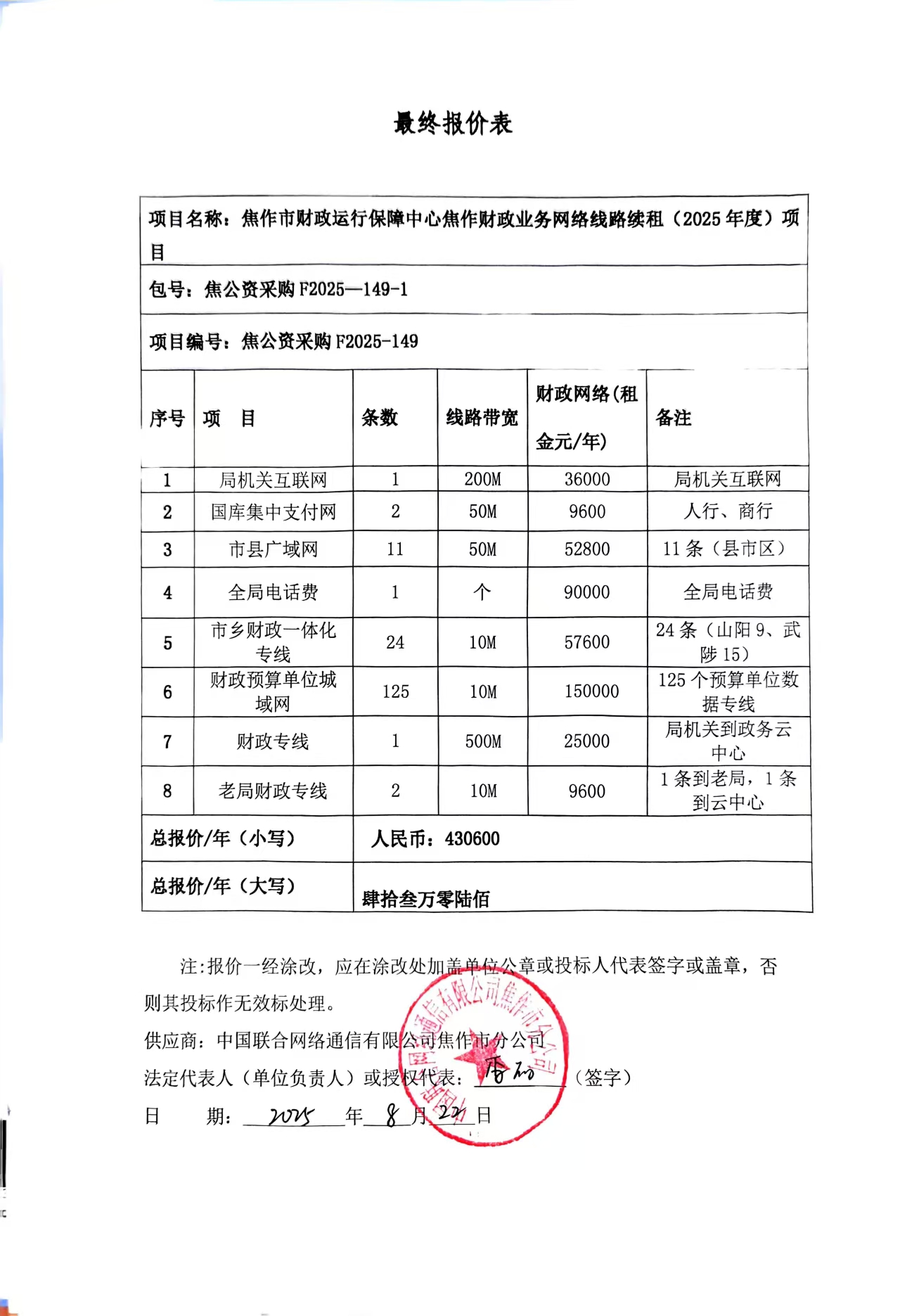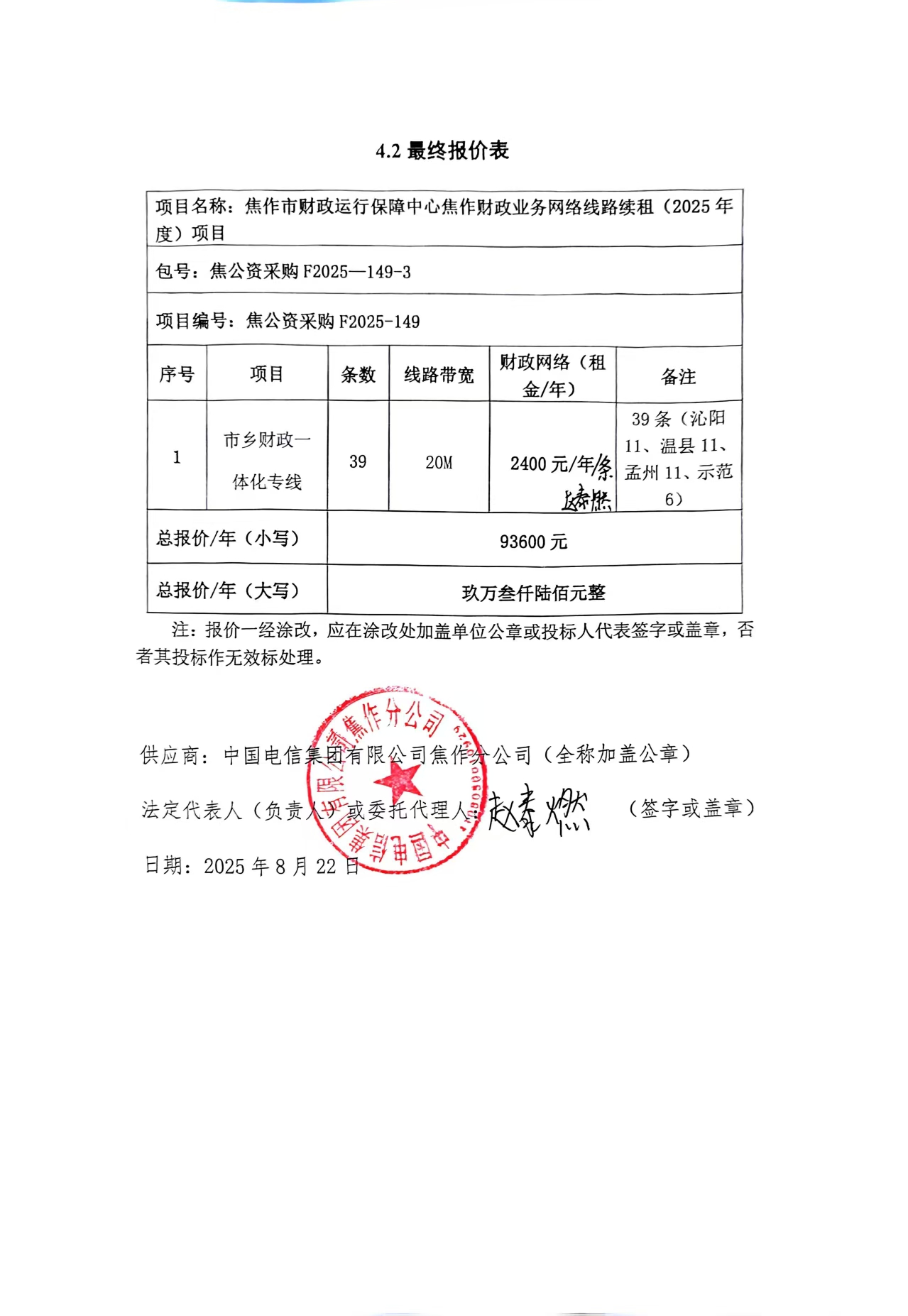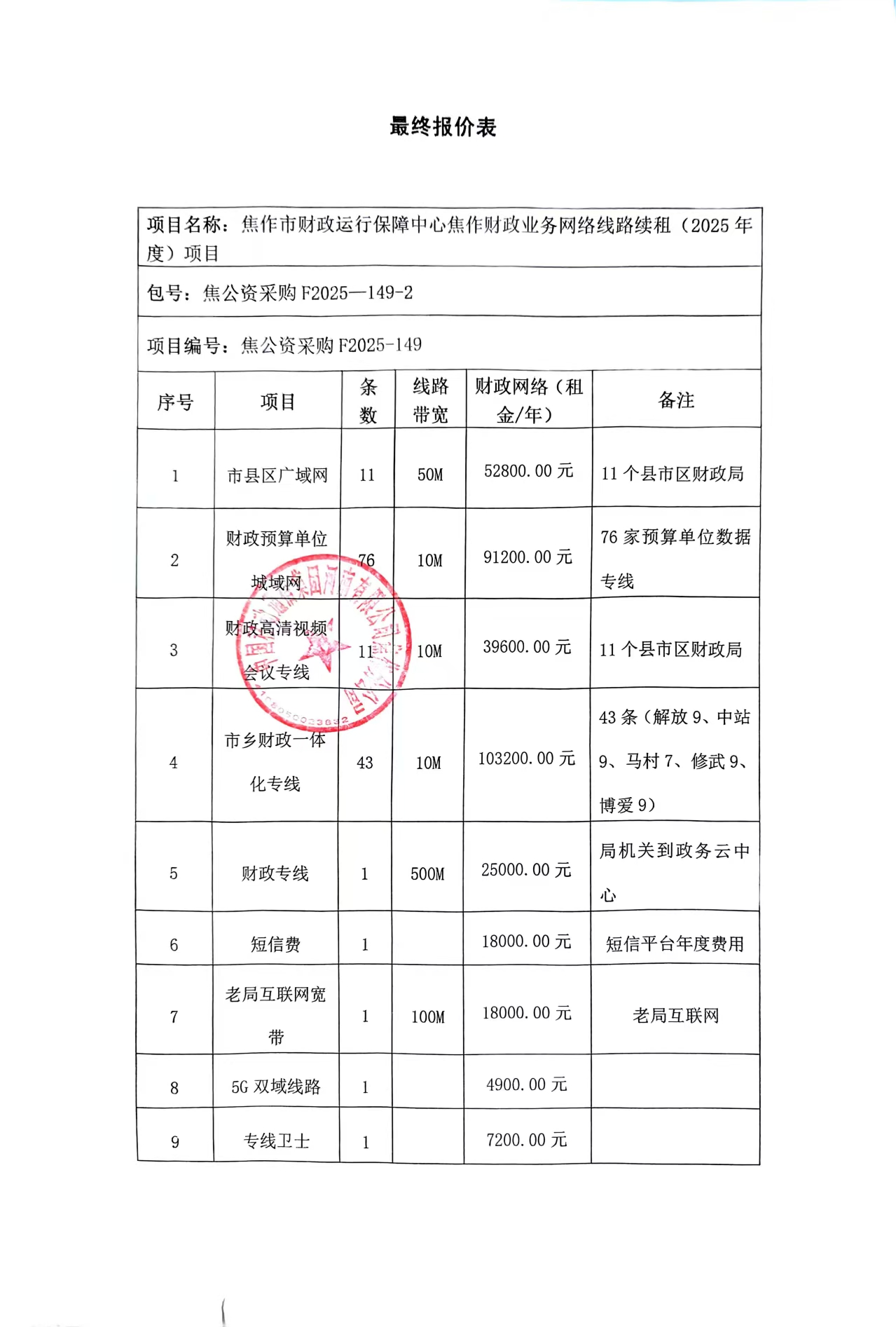 焦作市财政运行保障中心焦作财政业务网络线路续租(2025年度)项目-成交公告
