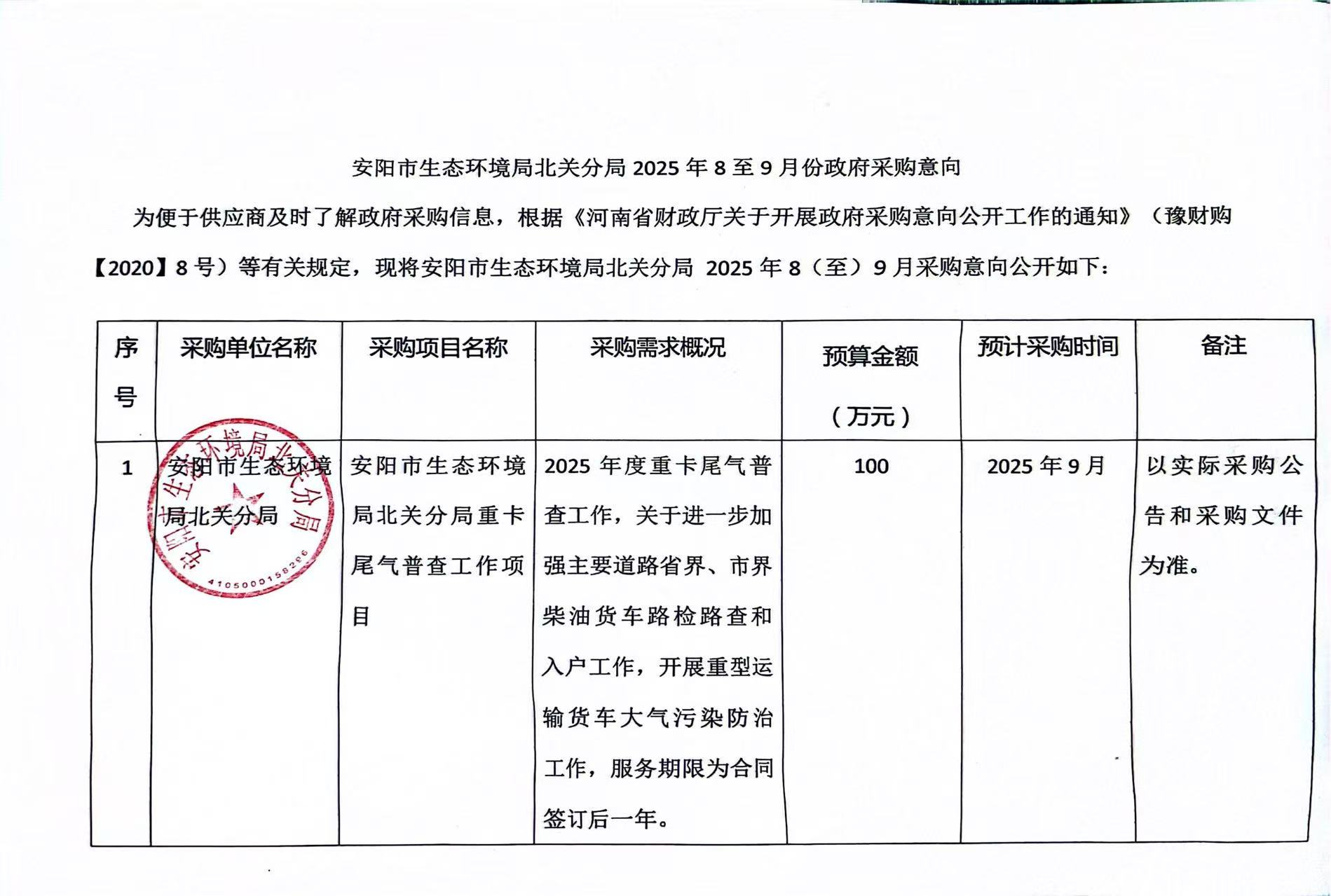 安阳市生态环境局北关分局2025年8至9月政府采购意向