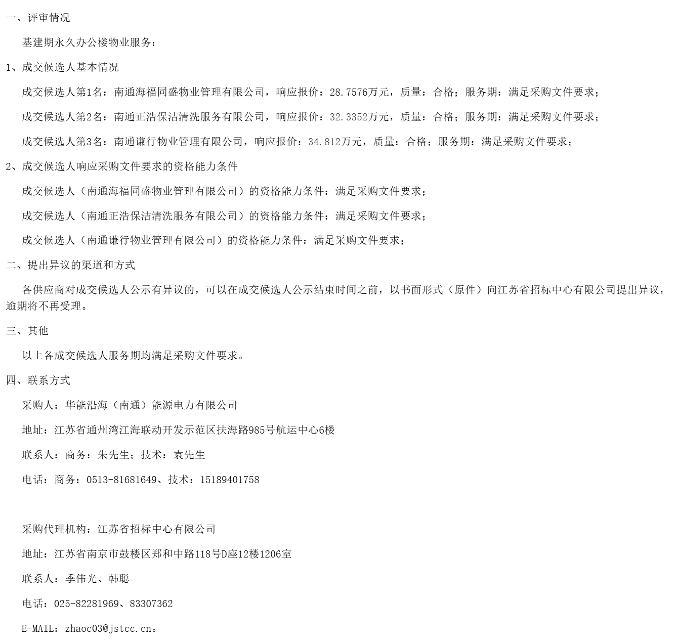 华能南通(通州湾)*×***万千瓦大型清洁高效煤电项目基建期永久办公楼物业服务成交候选人公示(***************)