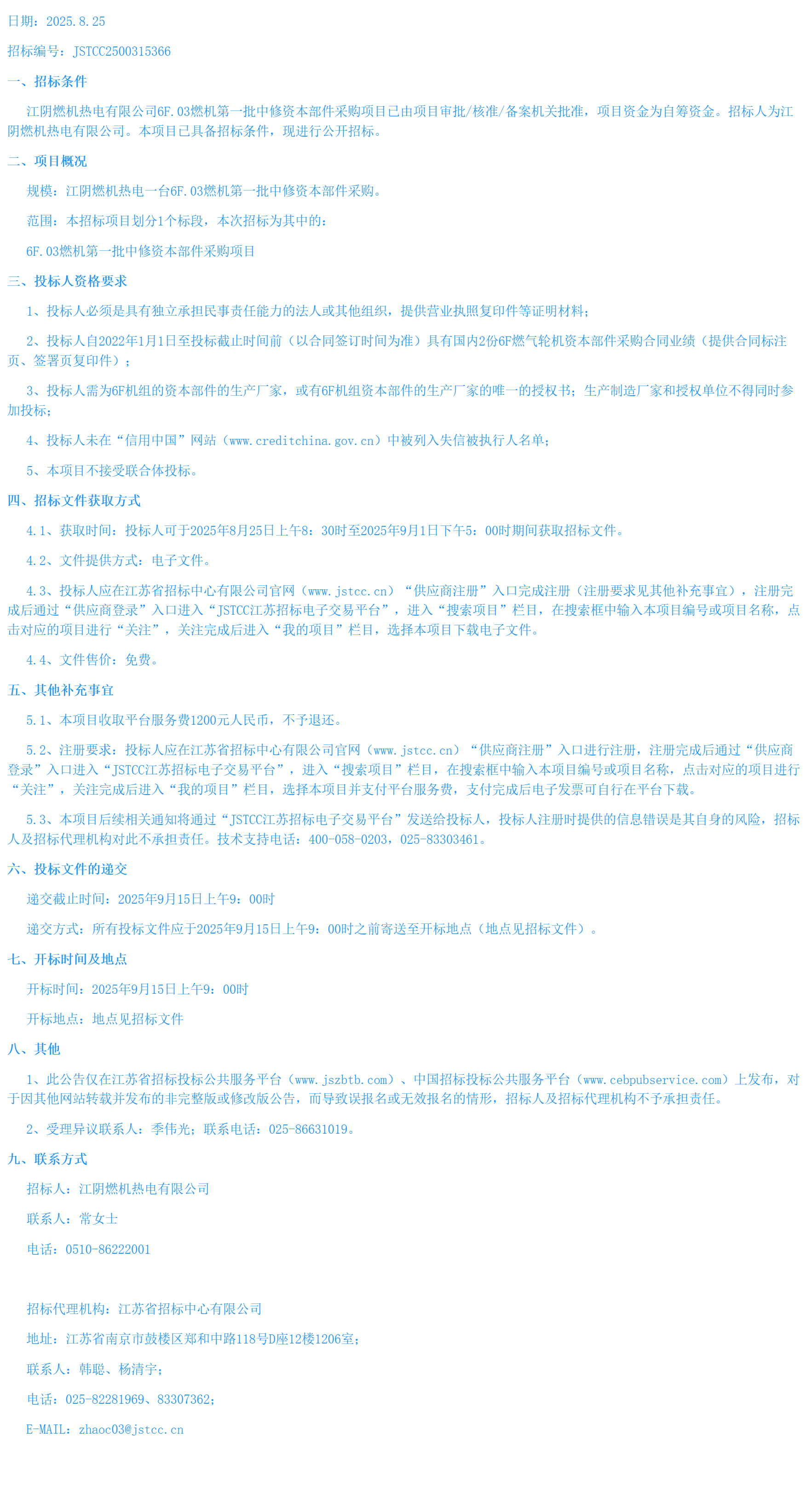 江阴燃机热电有限公司**.**燃机第一批中修资本部件采购项目招标公告(***************)