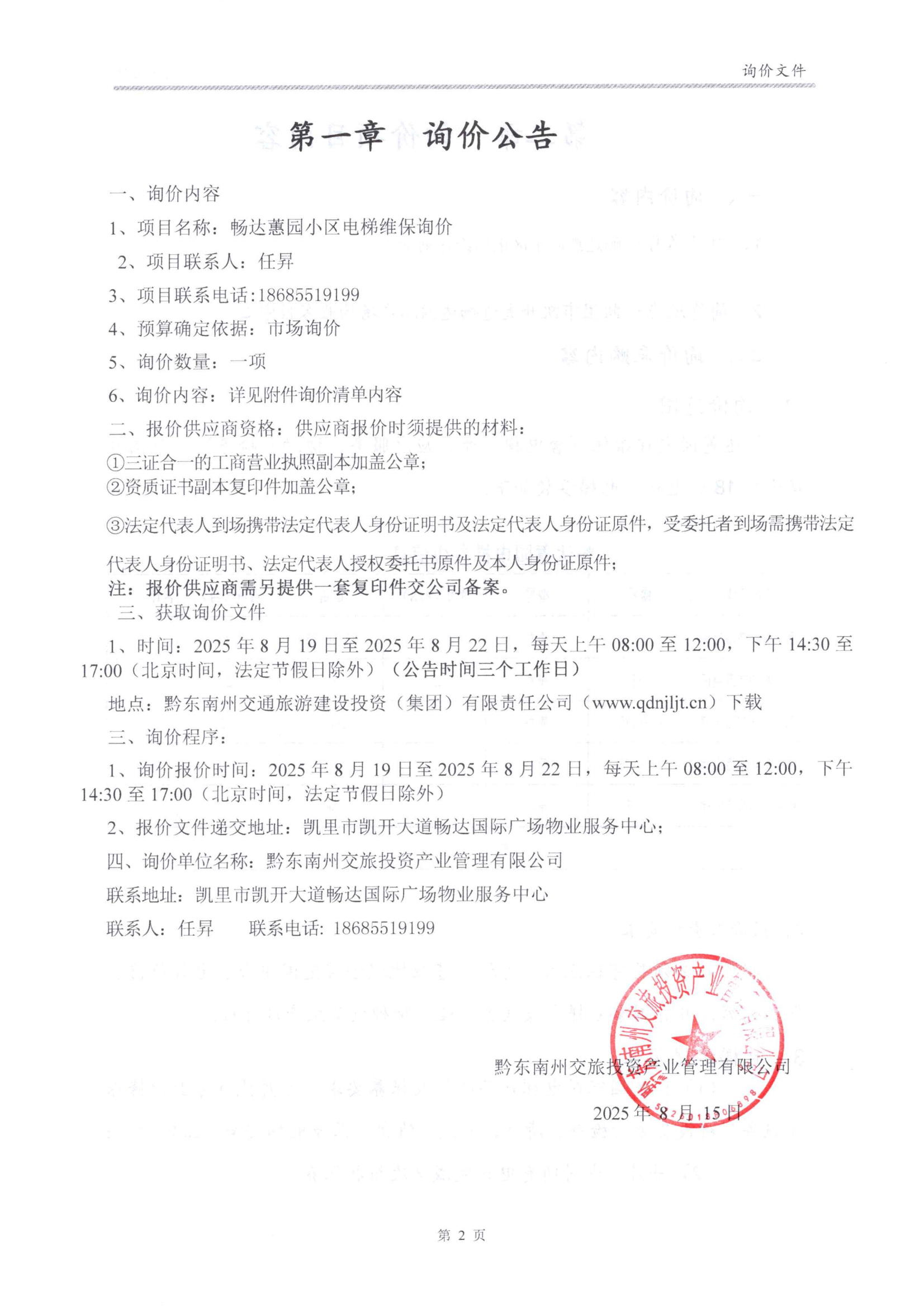 畅达蕙园小区电梯维保市场询价公告