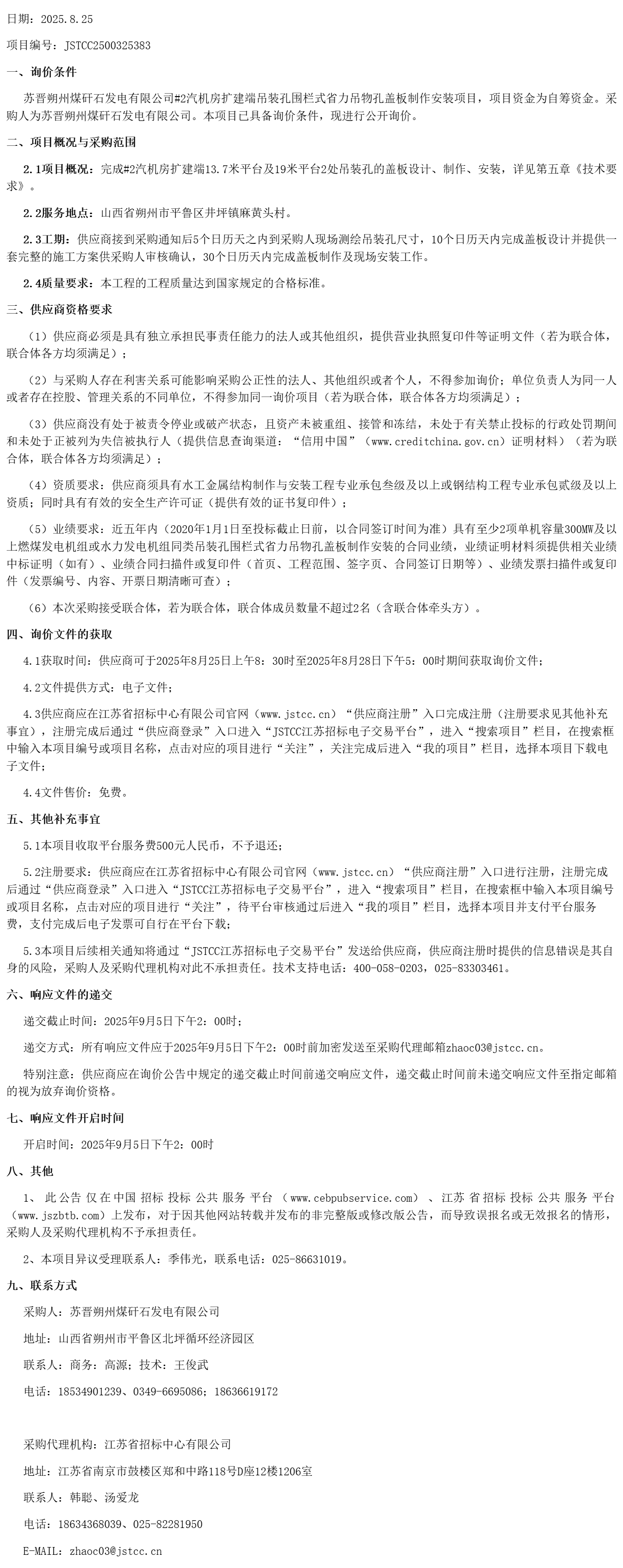 苏晋朔州煤矸石发电有限公司#*汽机房扩建端吊装孔围栏式省力吊物孔盖板制作安装项目询价公告(***************)