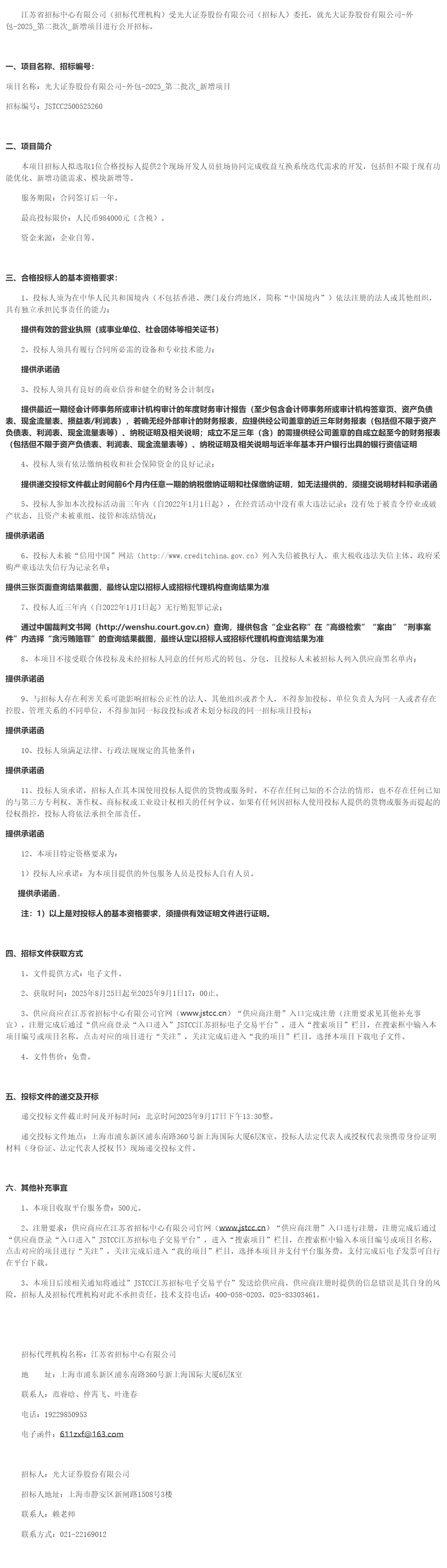 江苏省招标中心有限公司(招标代理机构)受光大证券股份有限公司(招标人)委托,就光大证券股份有限公司*外包******第二批次*新增项目进行公开招标。