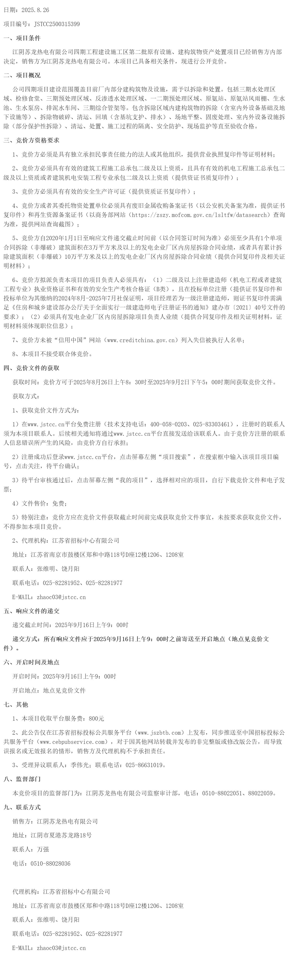 江阴苏龙热电有限公司四期工程建设施工区第二批原有设施、建构筑物资产处置项目竞价公告(***************)