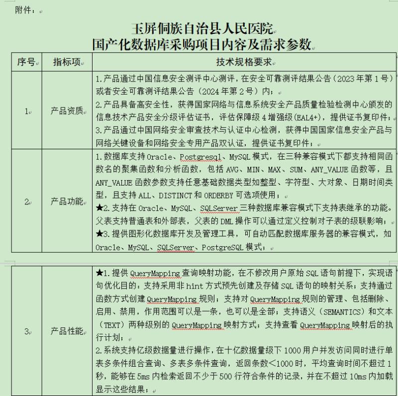 附件:玉屏侗族自治县人民医院国产化数据库采购项目内容及需求参数
