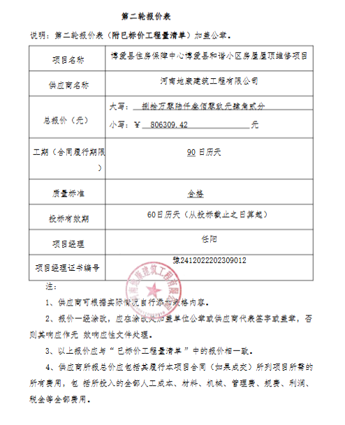 博爱县住房保障中心博爱县和谐小区房屋屋顶维修项目*成交公告