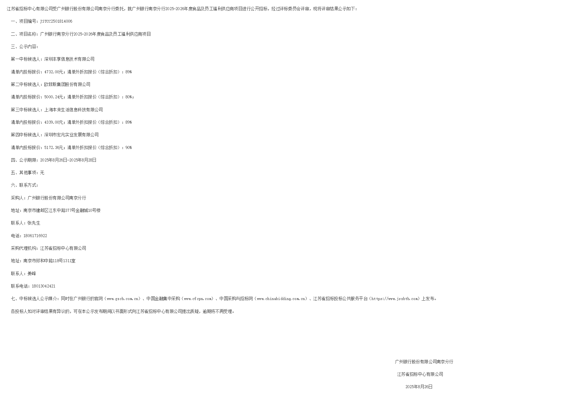 江苏省招标中心有限公司受广州银行股份有限公司南京分行委托,就广州银行南京分行*********年度食品及员工福利供应商项目进行公开招标,经过评标委员会评审,现将评审结果公示如下: