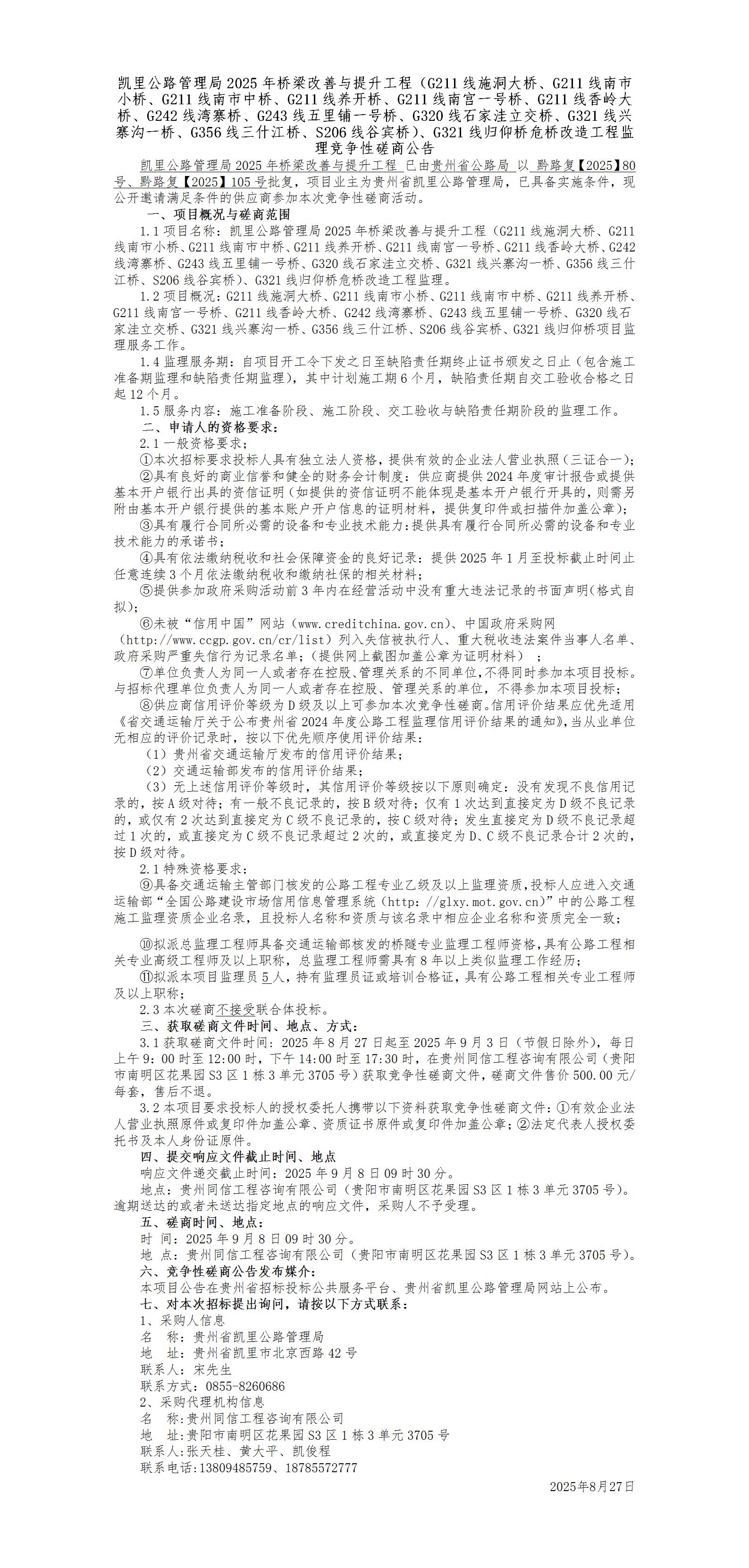 一号桥、G320线石家洼立交桥、G321线兴寨沟一桥、G356线三什江桥、S206线谷宾桥)、G321线归仰桥危桥改造工程监理竞争性磋商公告