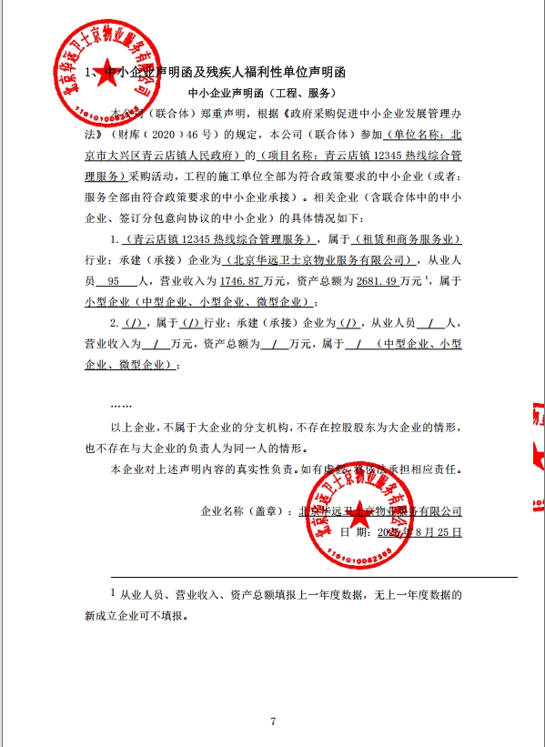 | 北京华远卫士京物业服务有限公司 | 北京市大兴区青云店镇青正街*号***室平房 | ****************** | ***.****** 万元 | 评审总得分(综合评分法): **.* 分 |