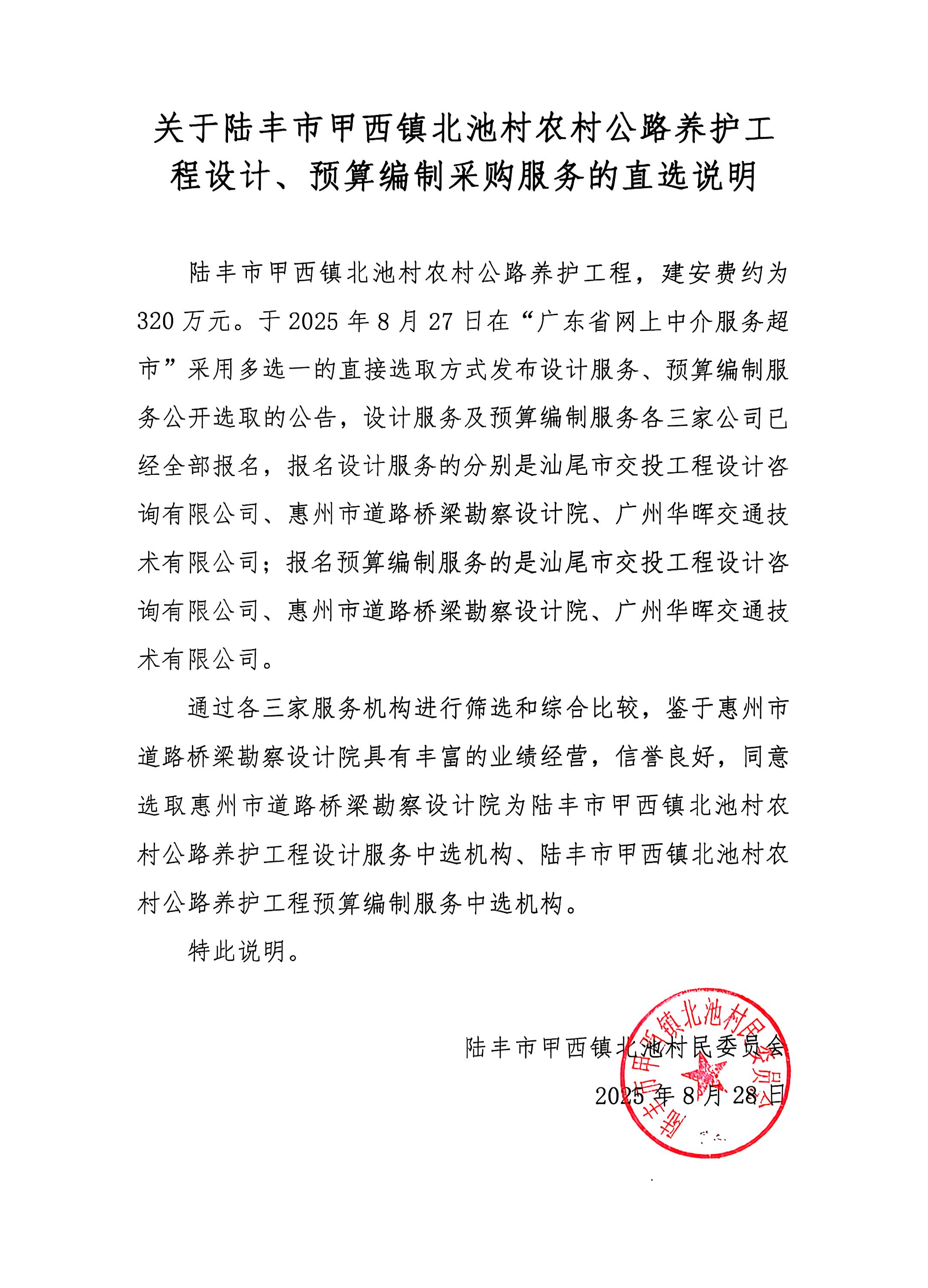 关于【陆丰市甲西镇北池村农村公路养护工程预算编制服务】中选结果的公告