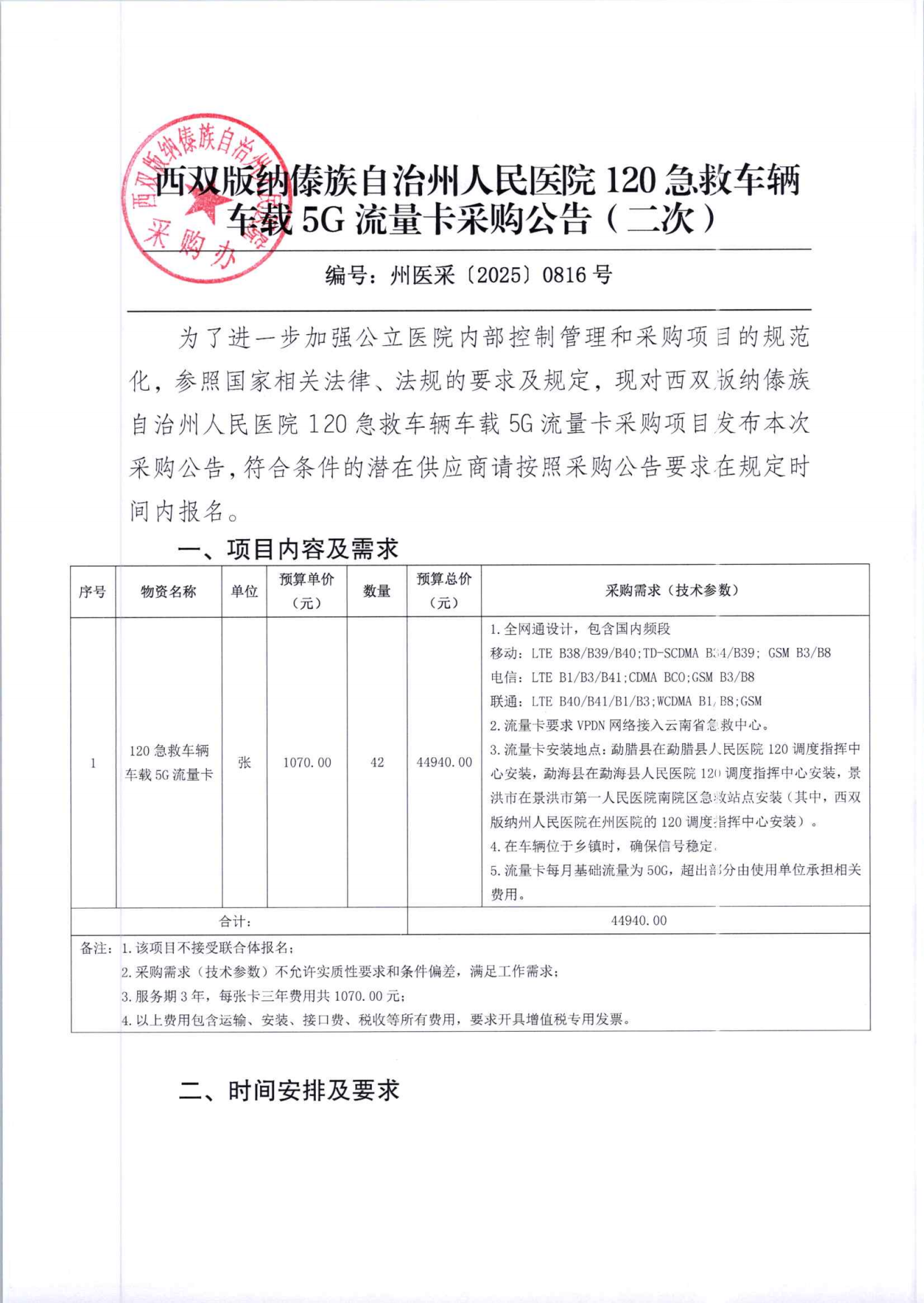 西双版纳傣族自治州人民医院120急救车辆车载5G流量卡采购公告(二次)