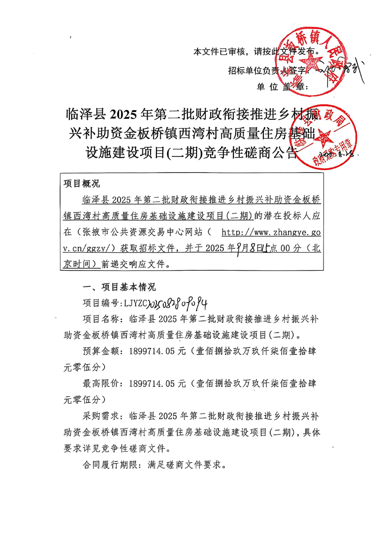 临泽县2025年第二批财政衔接推进乡村振兴补助资金板桥镇西湾村高质量住房基础设施建设项目(二期)竞争性磋商公告{type}