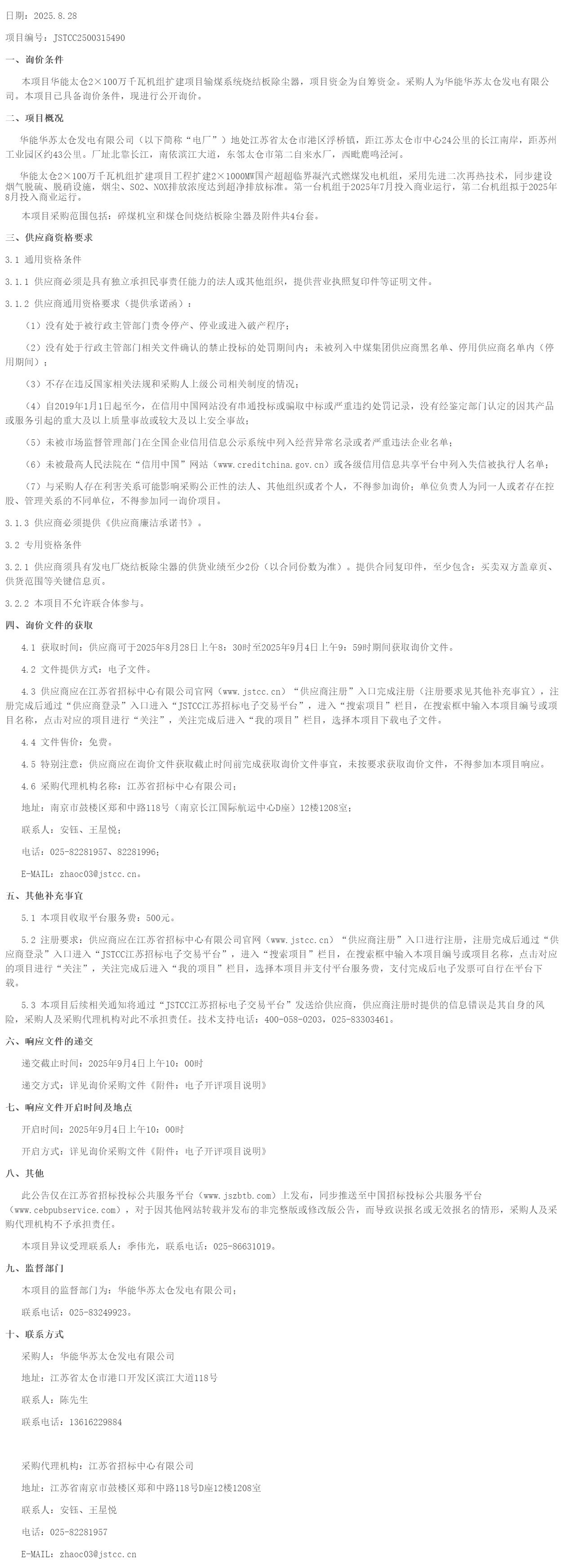 华能太仓*×***万千瓦机组扩建项目输煤系统烧结板除尘器询价公告(***************)